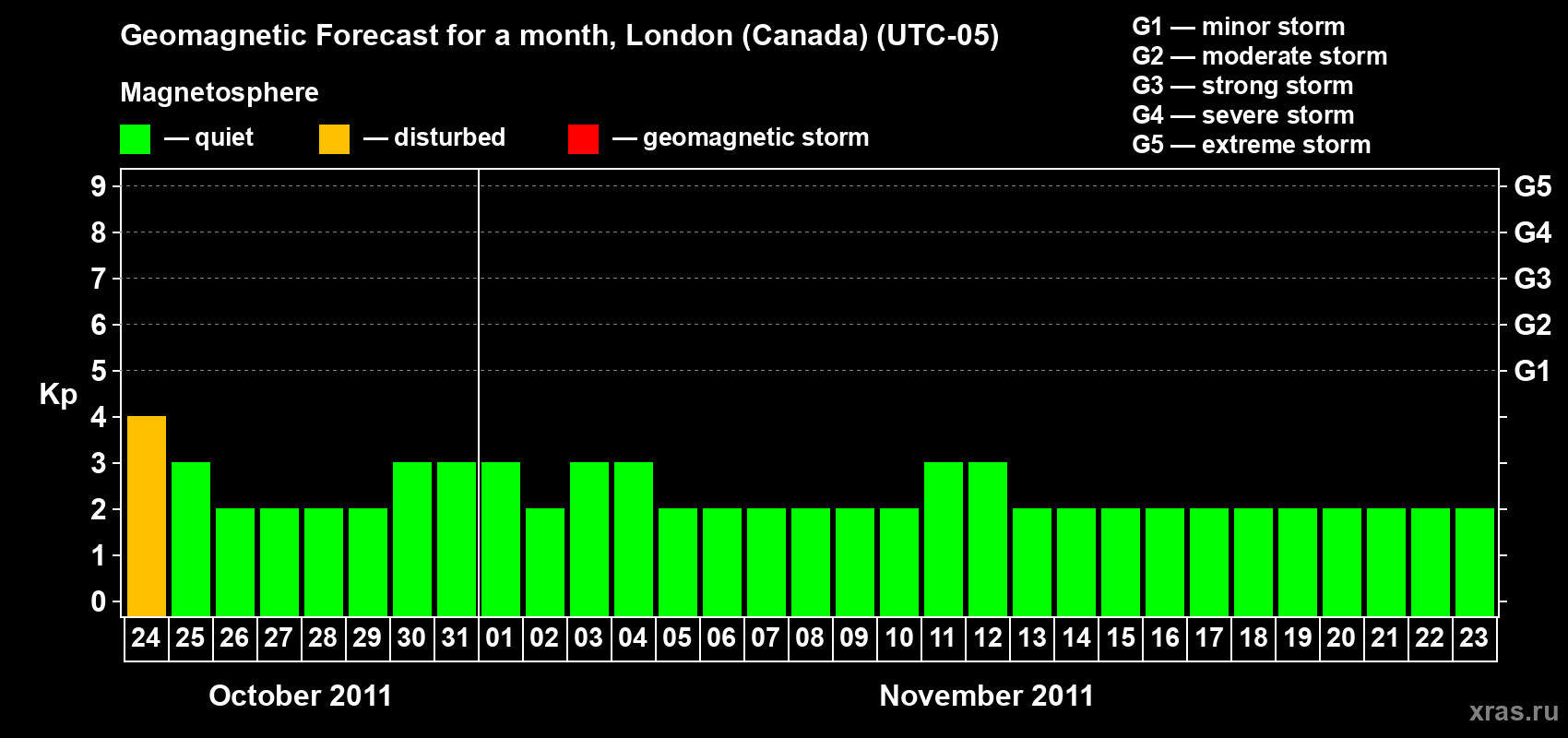 Geomagnetic storm forecast in London (Canada) for Oct 24, 2011