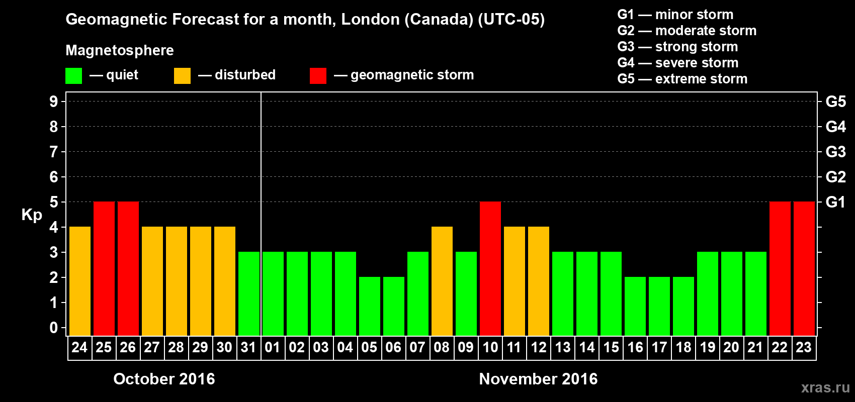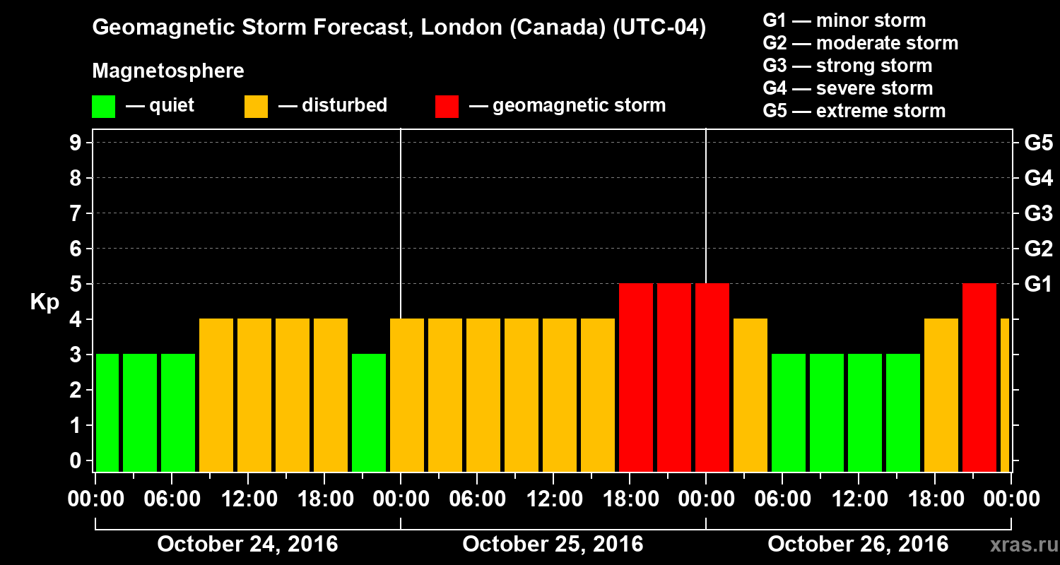 Geomagnetic storm forecast in London (Canada) for Oct 24, 2016