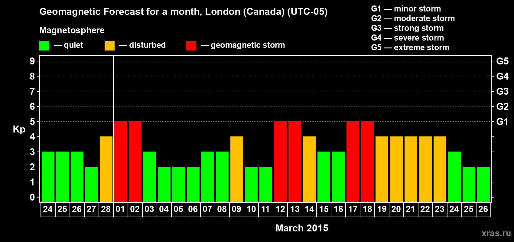 Geomagnetic storm forecast in London (Canada) for Feb 24, 2015