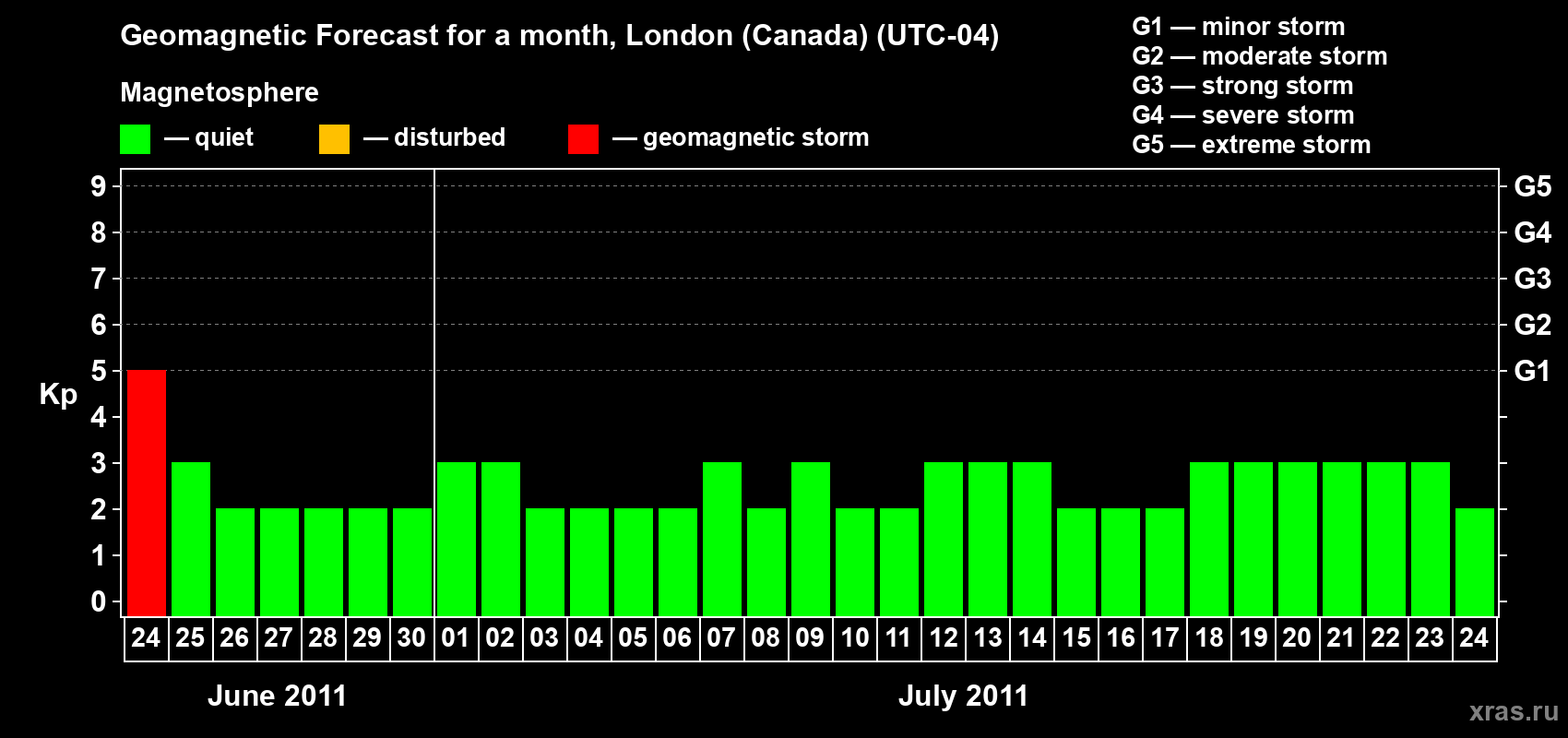 Geomagnetic storm forecast in London (Canada) for Jun 24, 2011