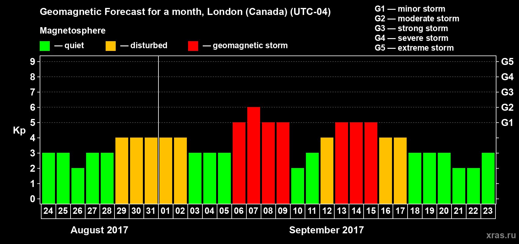 Geomagnetic storm forecast in London (Canada) for Aug 24, 2017