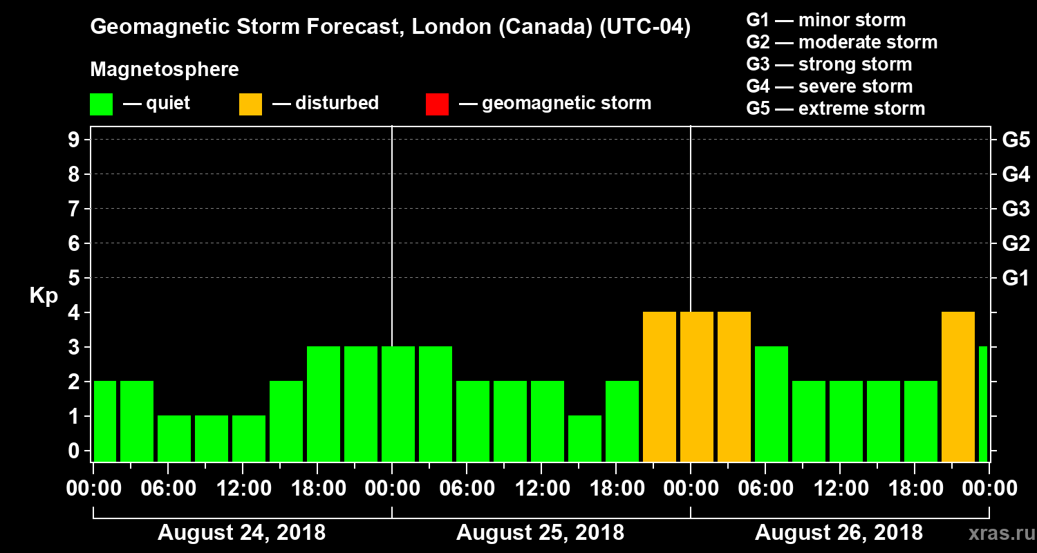 Geomagnetic storm forecast in London (Canada) for Aug 24, 2018
