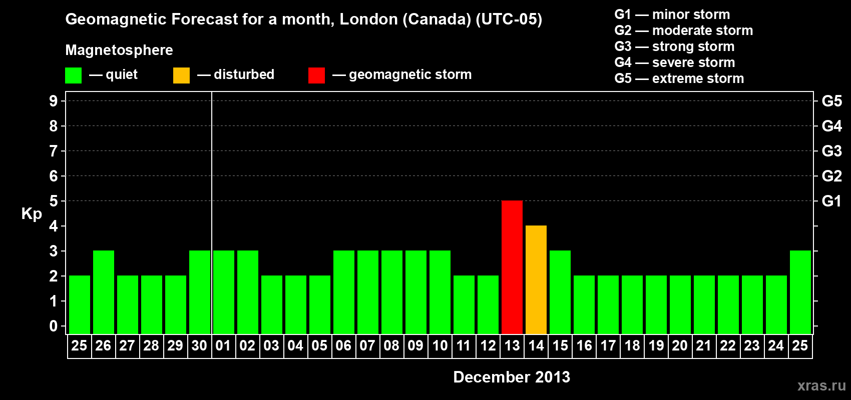 Geomagnetic storm forecast in London (Canada) for Nov 25, 2013