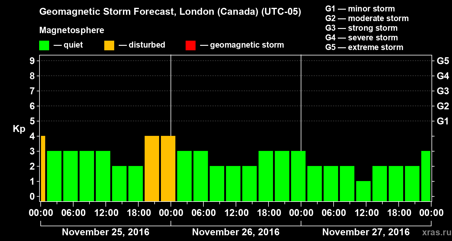 Geomagnetic storm forecast in London (Canada) for Nov 25, 2016