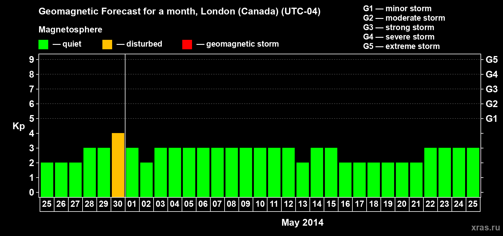 Geomagnetic storm forecast in London (Canada) for Apr 25, 2014