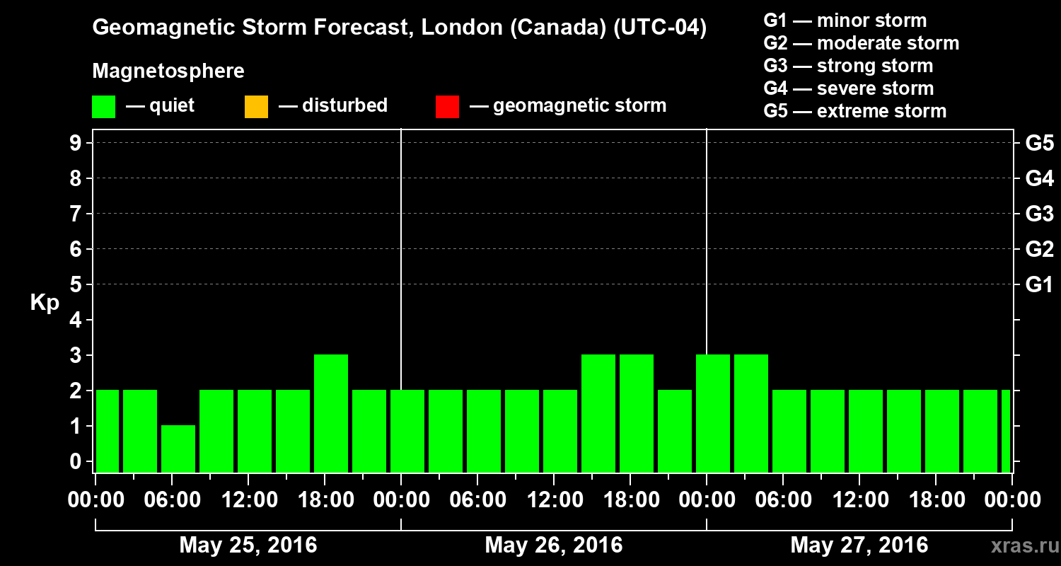 Geomagnetic activity forecast in London (Canada) — May 25, 2016