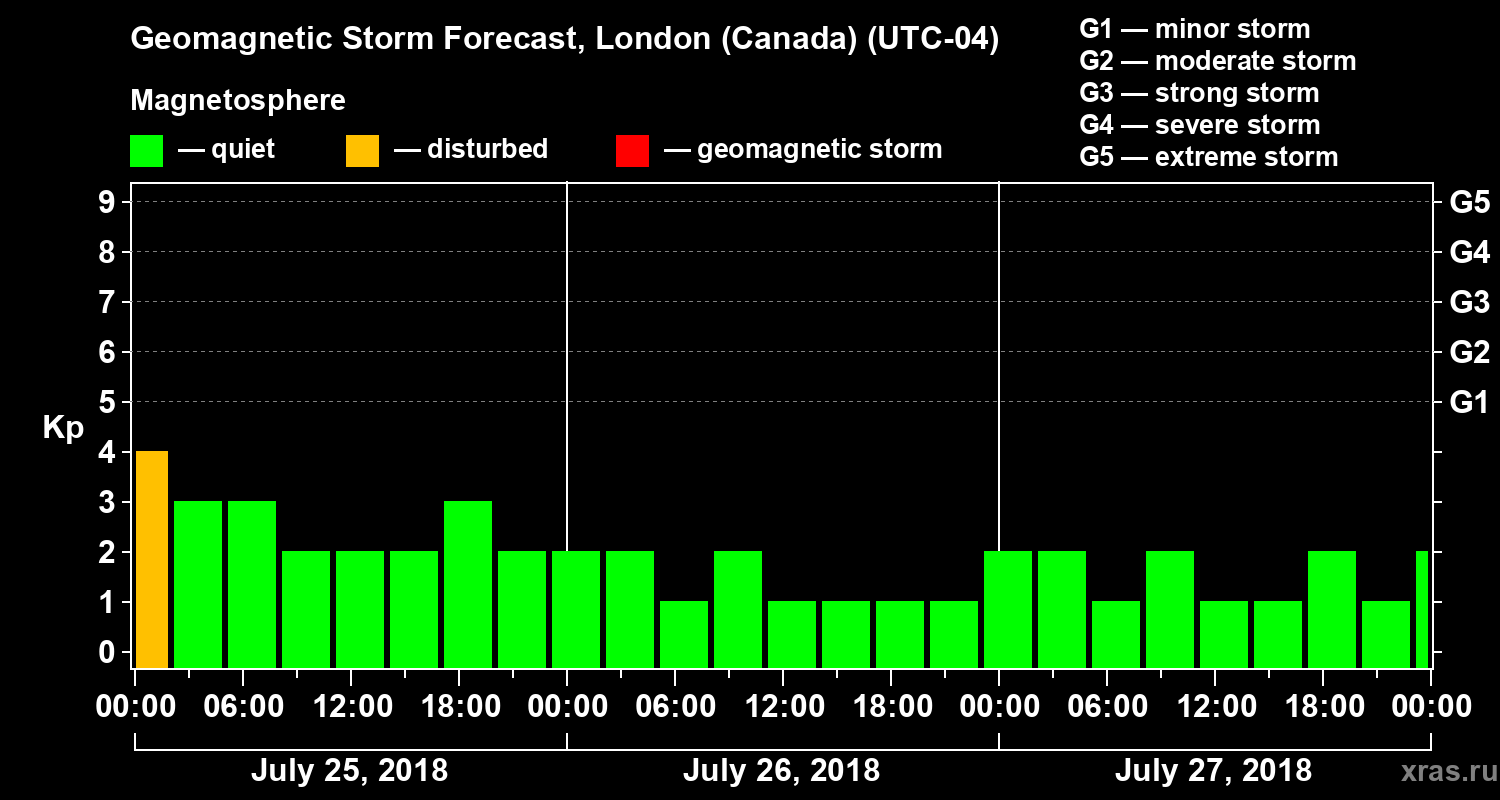Geomagnetic storm forecast in London (Canada) for Jul 25, 2018