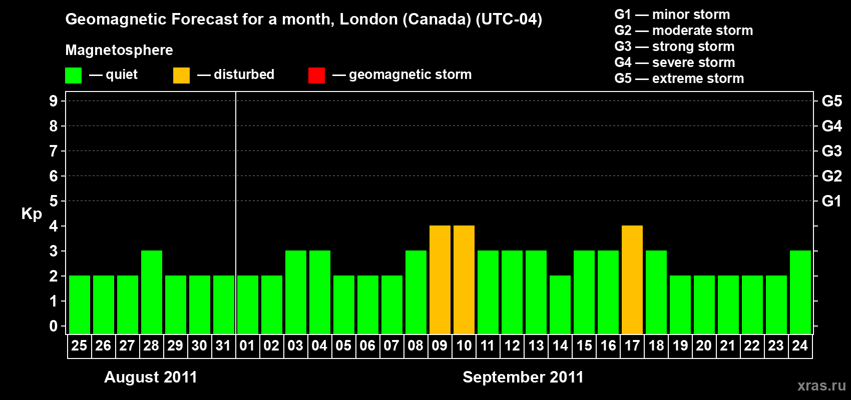 Geomagnetic storm forecast in London (Canada) for Aug 25, 2011