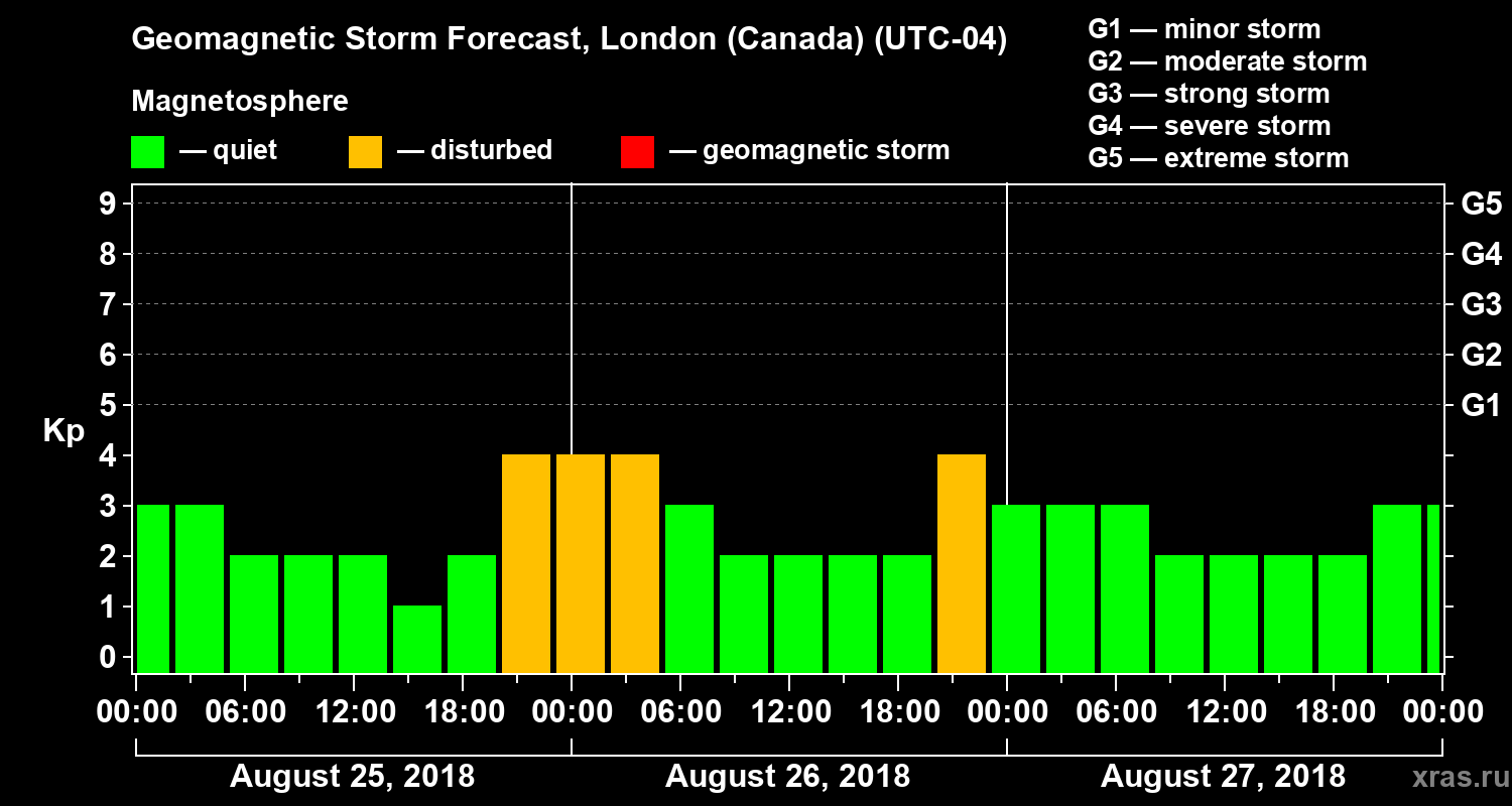 Geomagnetic storm forecast in London (Canada) for Aug 25, 2018