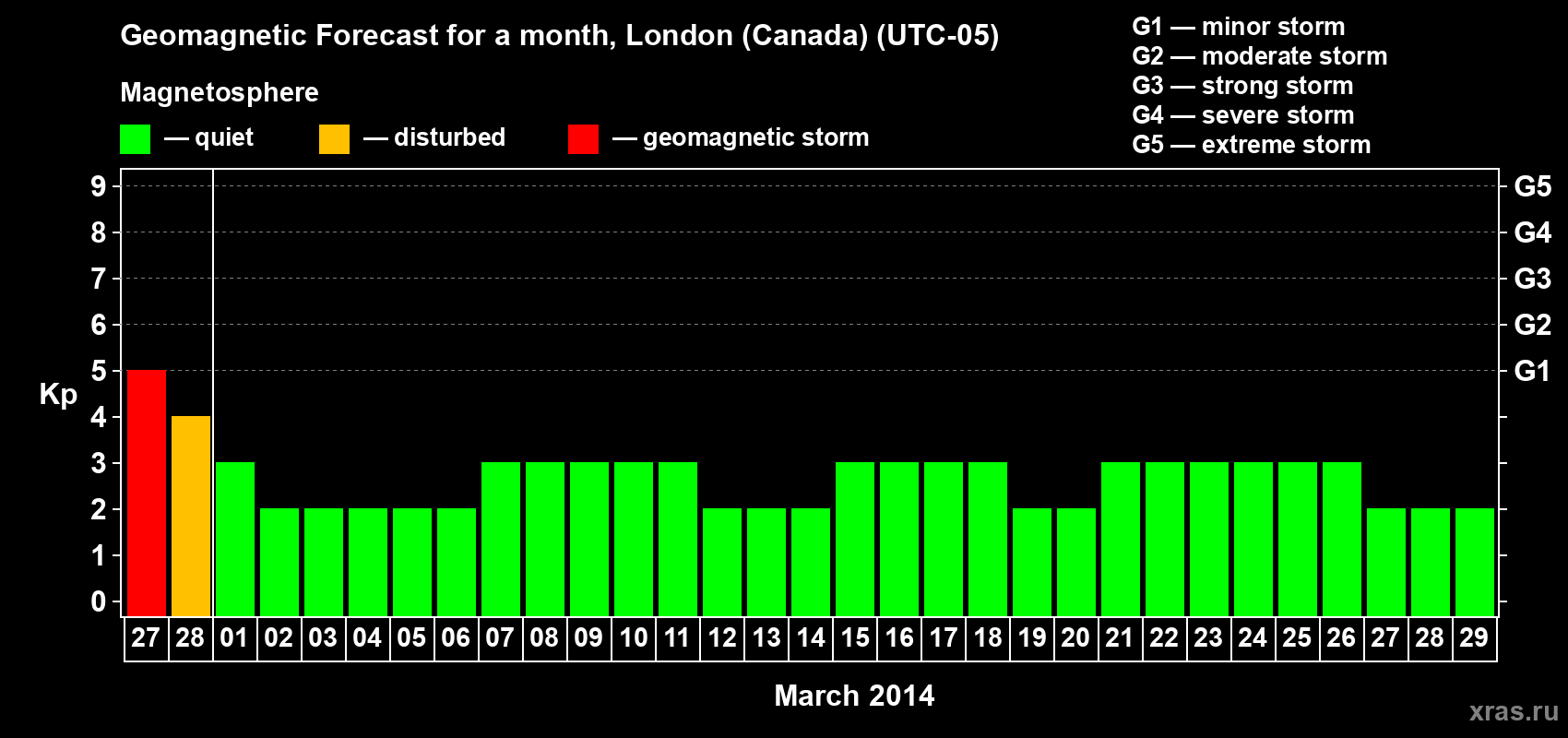 Geomagnetic storm forecast in London (Canada) for Feb 27, 2014