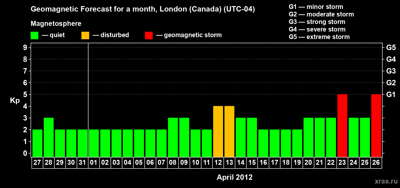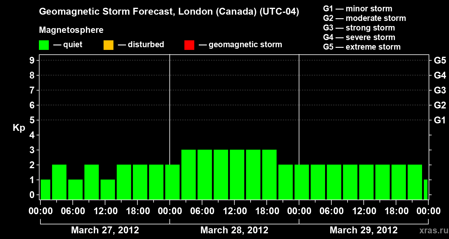 Geomagnetic storm forecast in London (Canada) for Mar 27, 2012