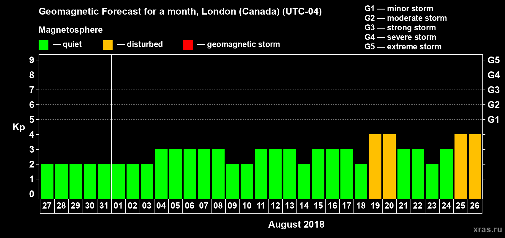 Geomagnetic storm forecast in London (Canada) for Jul 27, 2018