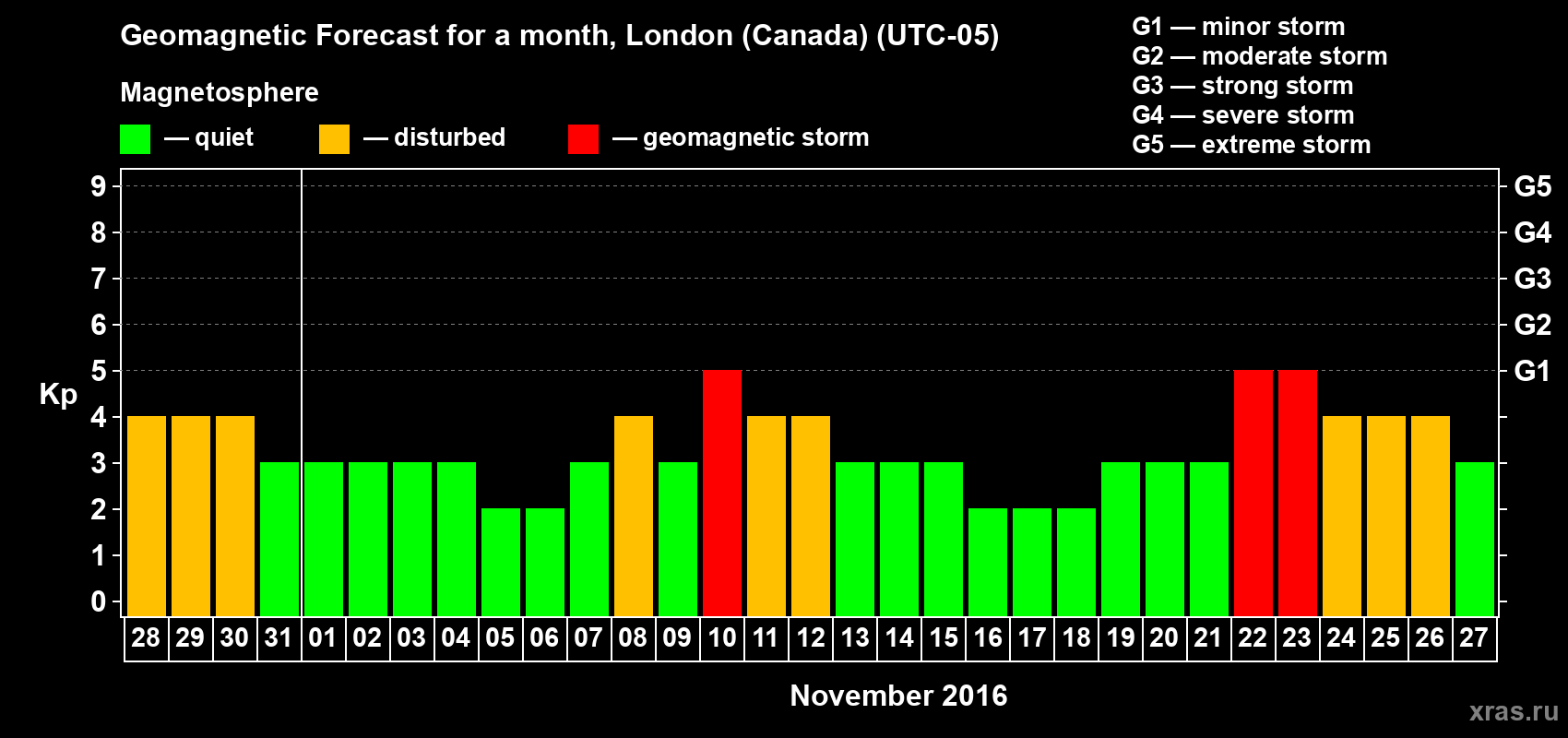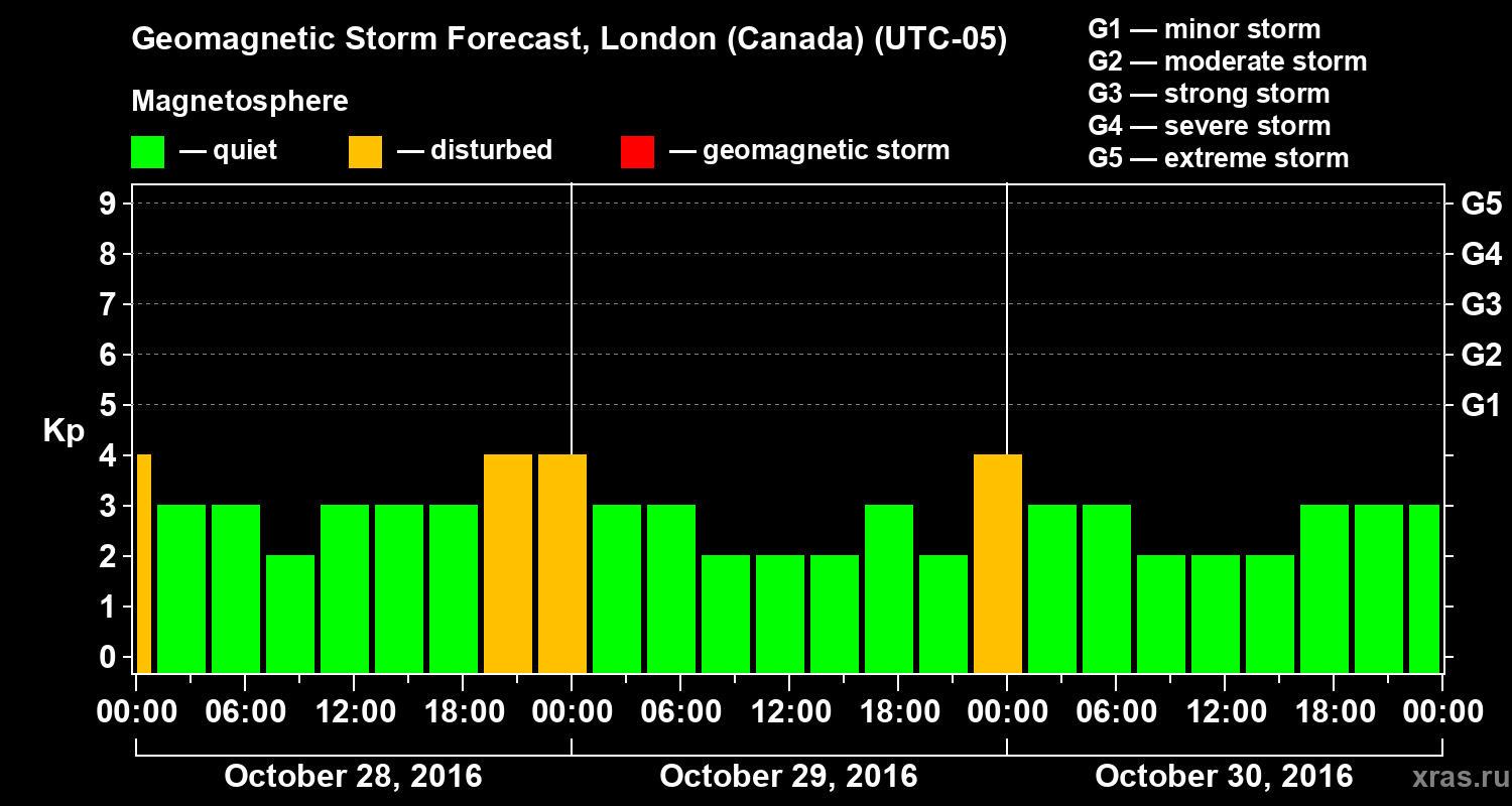 Geomagnetic storm forecast in London (Canada) for Oct 28, 2016