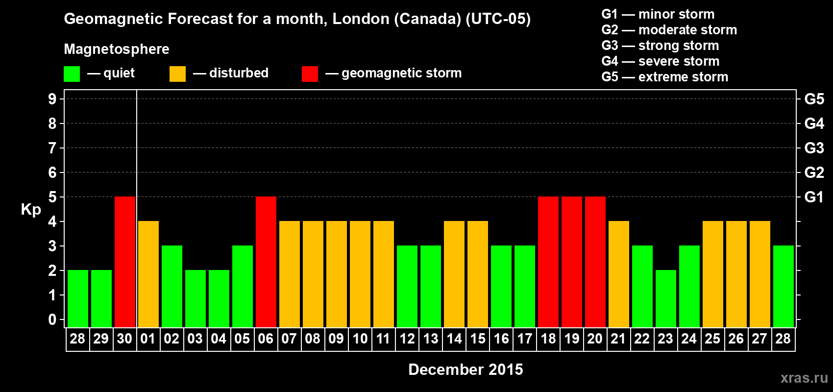 Geomagnetic storm forecast in London (Canada) for Nov 28, 2015