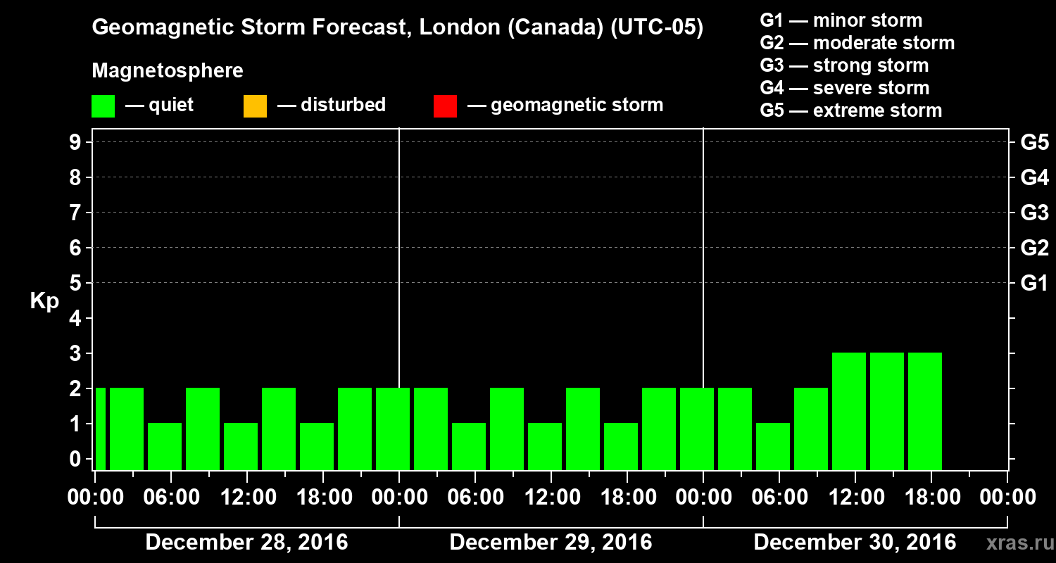 Geomagnetic storm forecast in London (Canada) for Dec 28, 2016