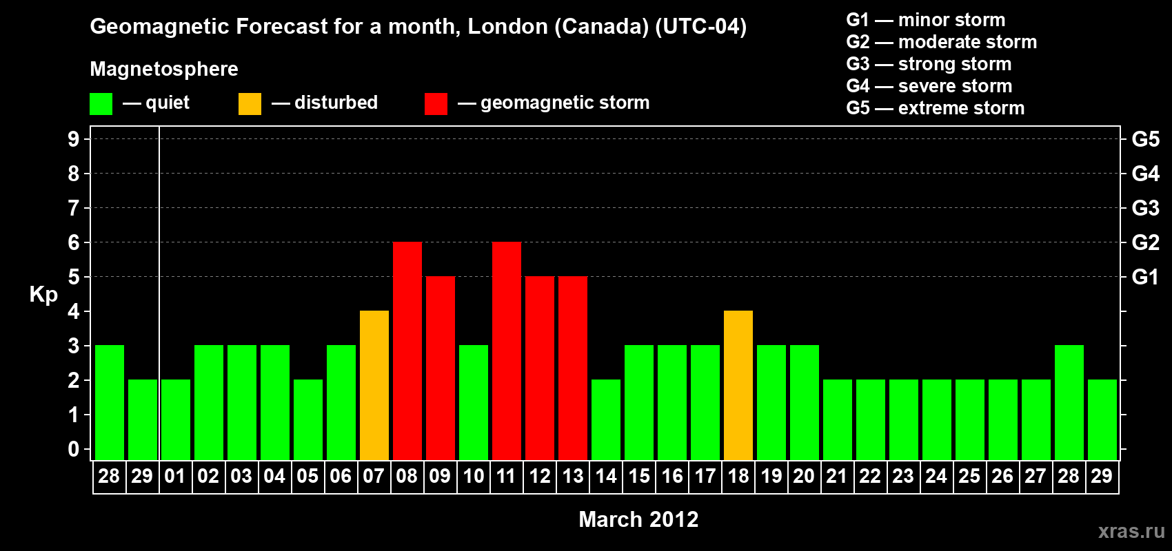 Geomagnetic storm forecast in London (Canada) for Feb 28, 2012