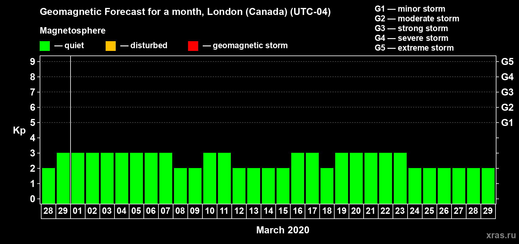 Geomagnetic storm forecast in London (Canada) for Feb 28, 2020