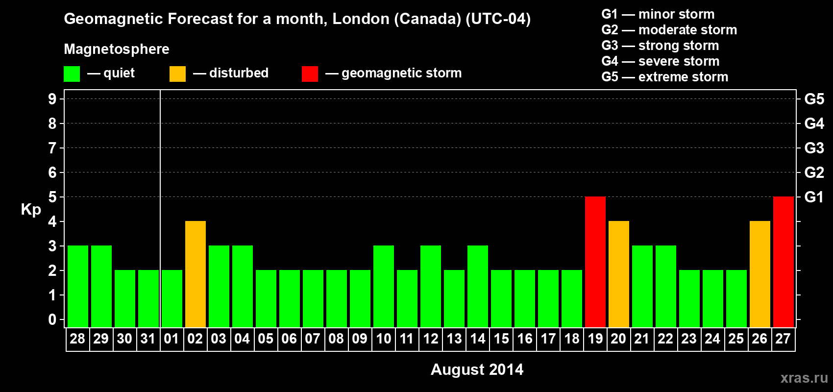 Geomagnetic storm forecast in London (Canada) for Jul 28, 2014