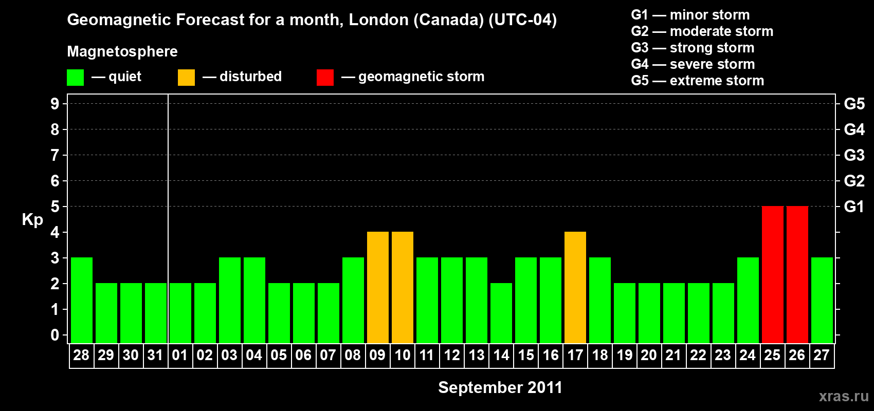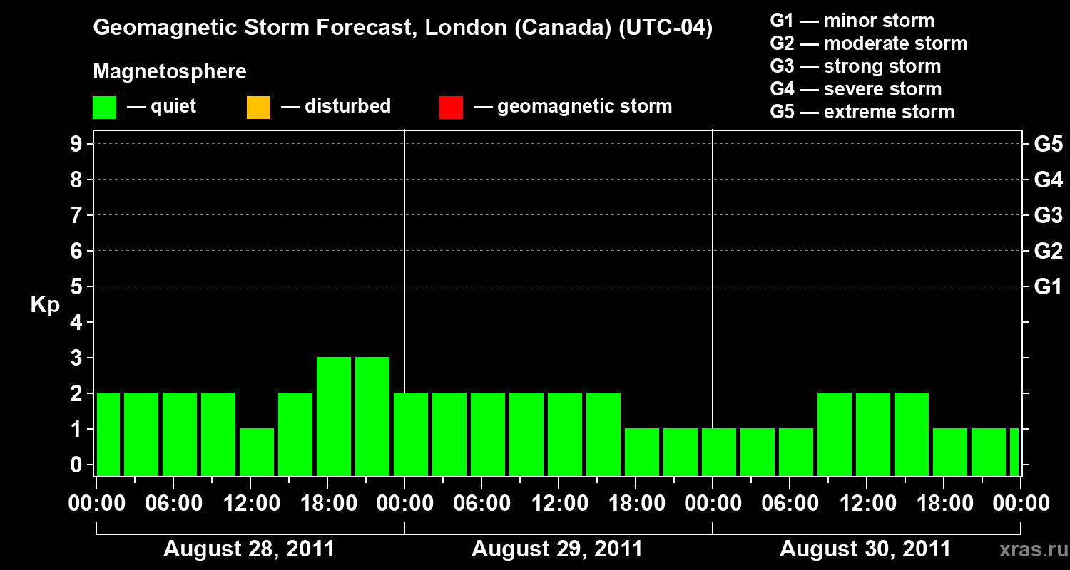 Geomagnetic storm forecast in London (Canada) for Aug 28, 2011