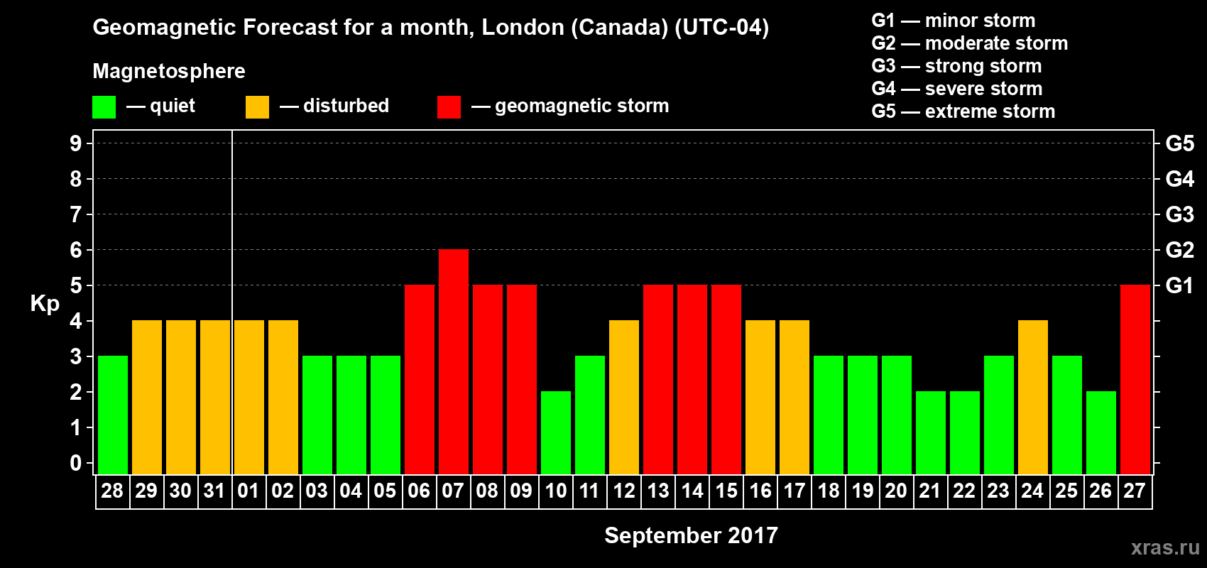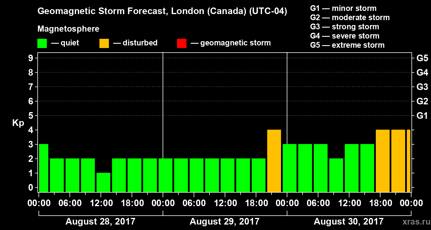 Geomagnetic storm forecast in London (Canada) for Aug 28, 2017