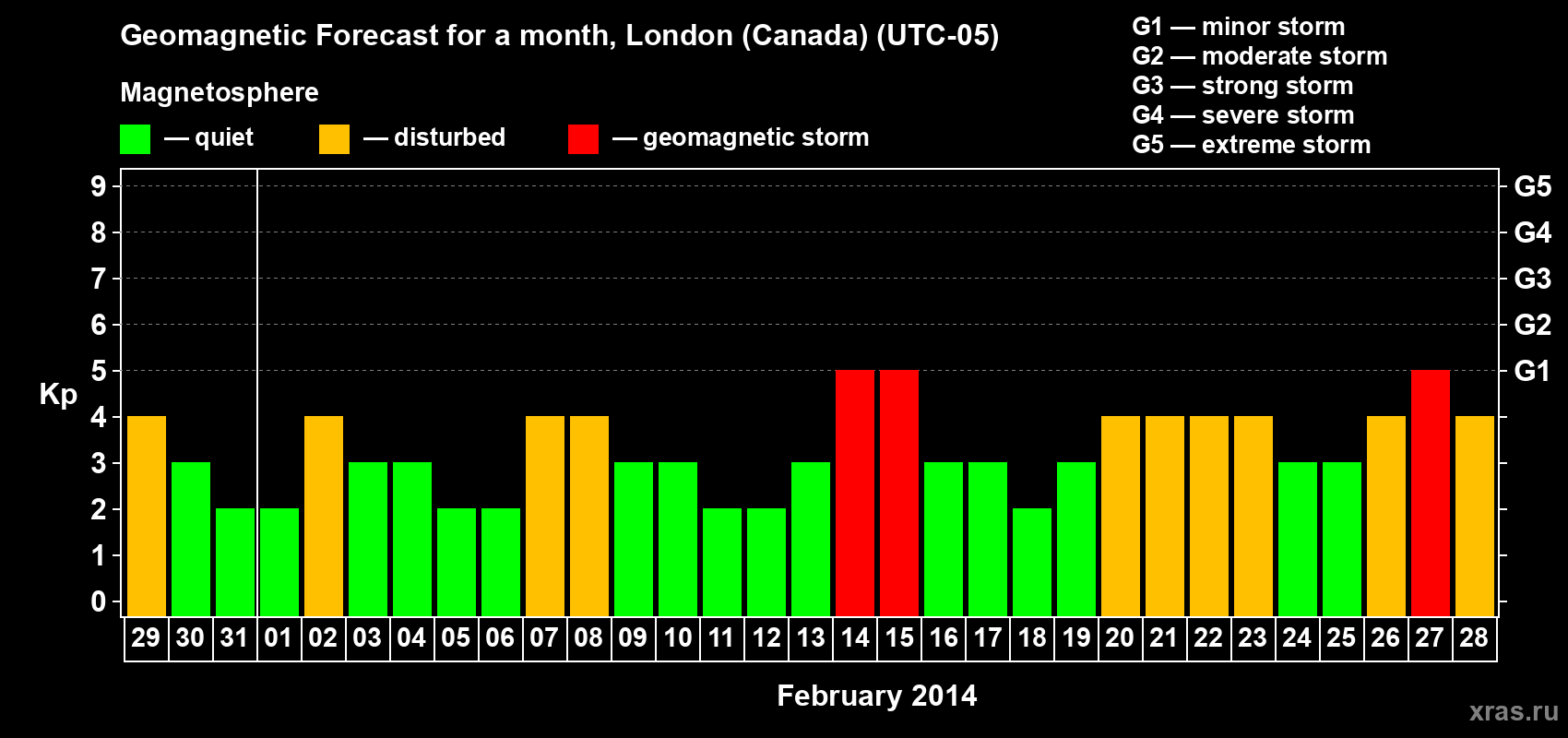 Geomagnetic storm forecast in London (Canada) for Jan 29, 2014