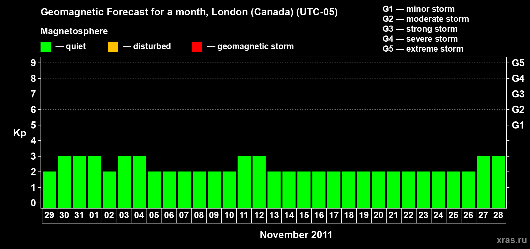 Geomagnetic storm forecast in London (Canada) for Oct 29, 2011