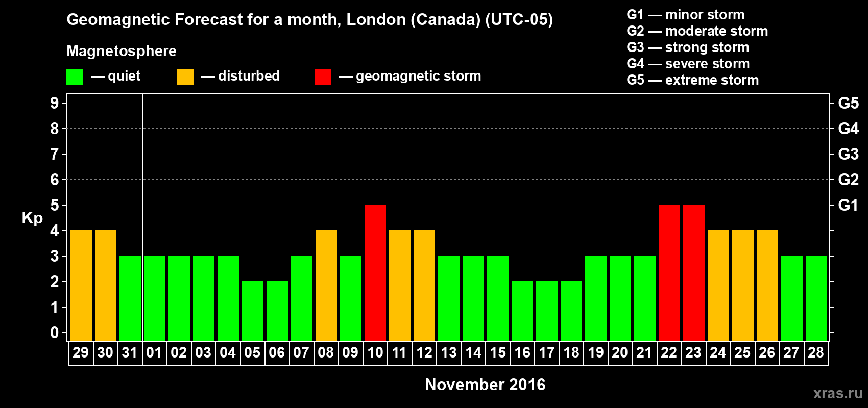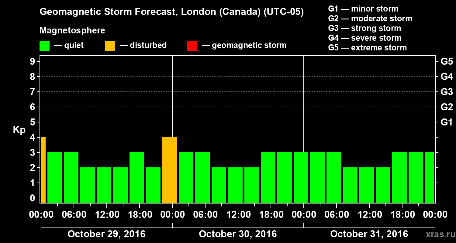 Geomagnetic storm forecast in London (Canada) for Oct 29, 2016