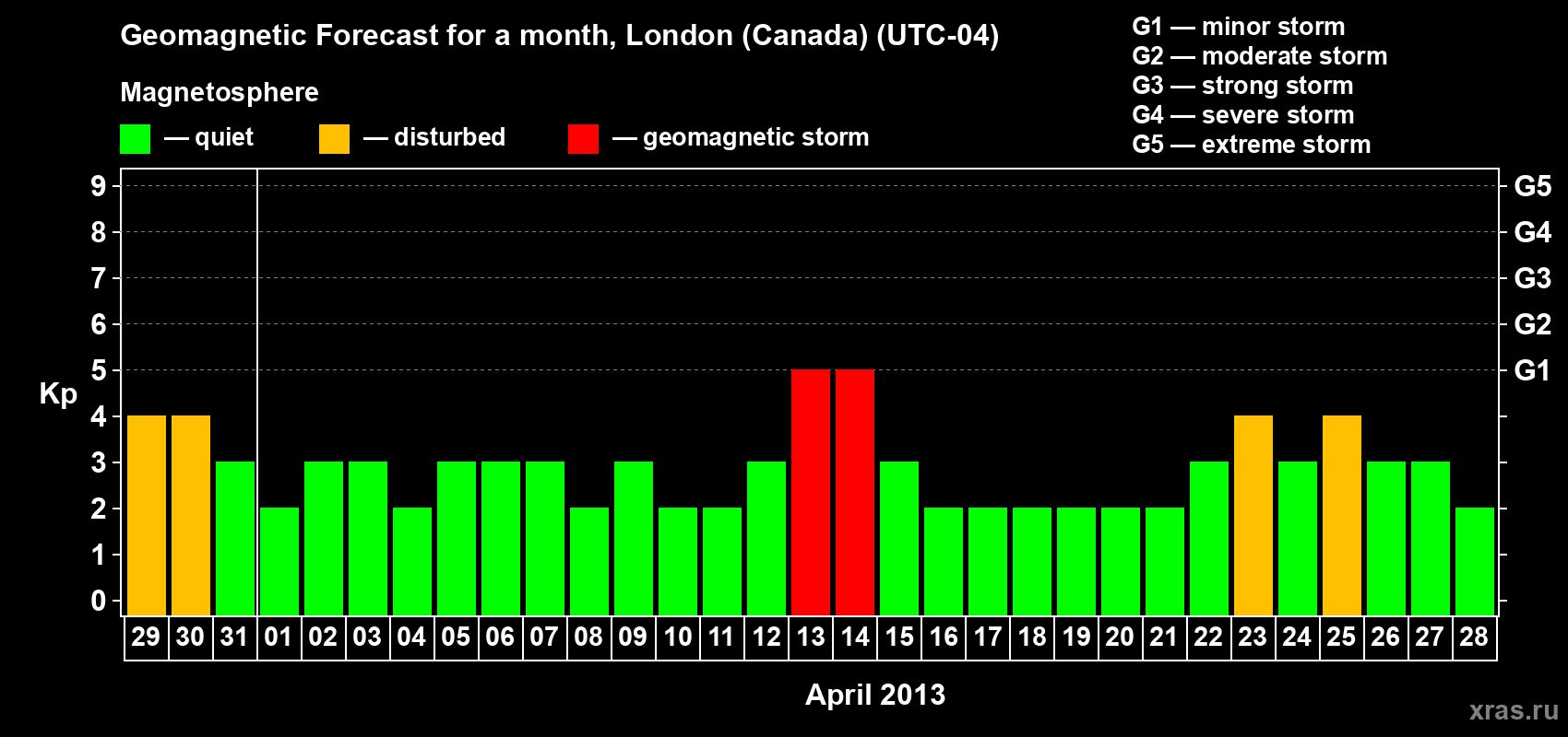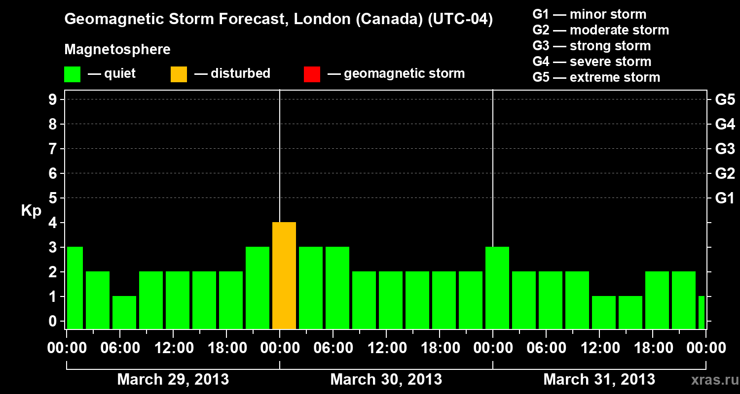 Geomagnetic storm forecast in London (Canada) for Mar 29, 2013