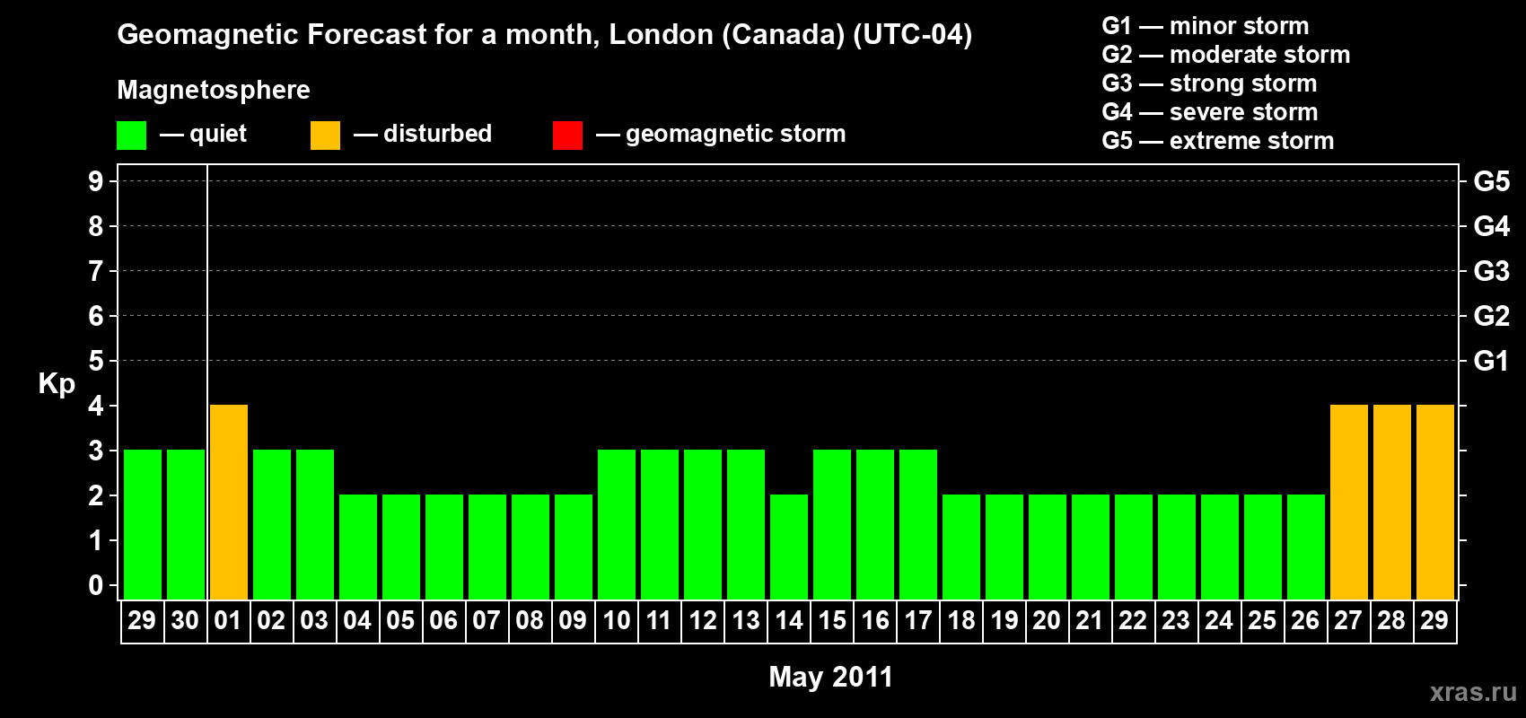Geomagnetic storm forecast in London (Canada) for Apr 29, 2011
