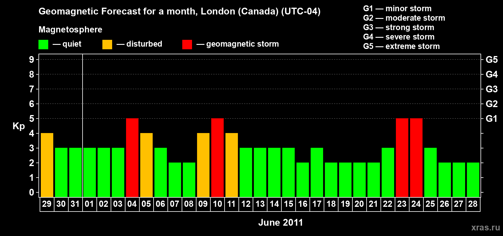 Geomagnetic storm forecast in London (Canada) for May 29, 2011