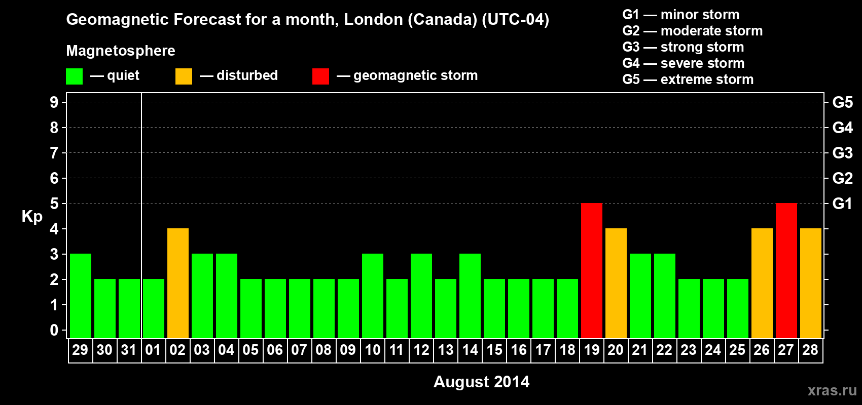 Geomagnetic storm forecast in London (Canada) for Jul 29, 2014