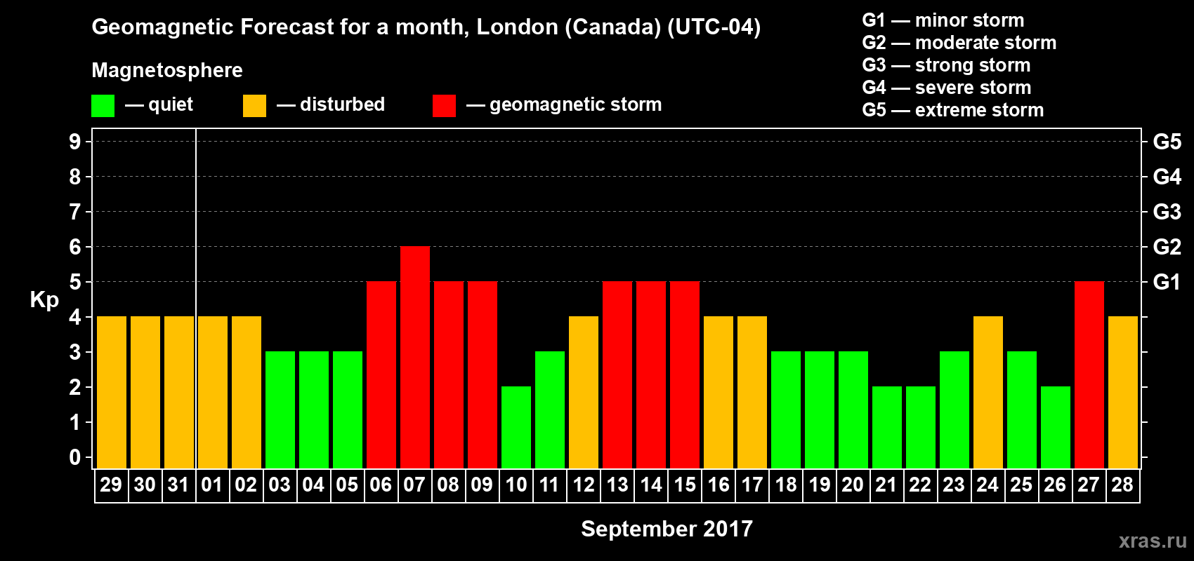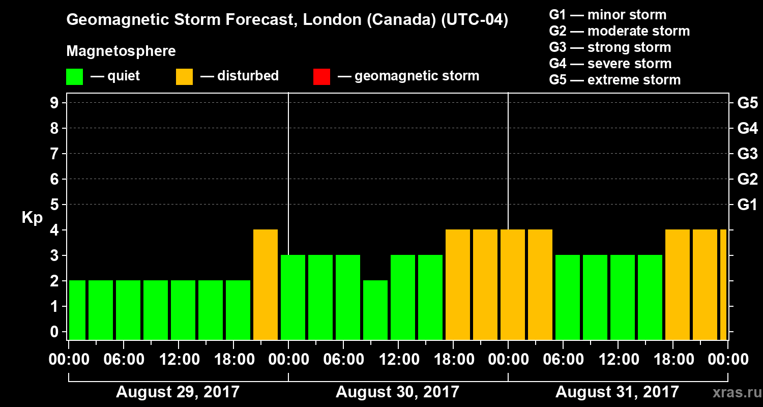 Geomagnetic storm forecast in London (Canada) for Aug 29, 2017