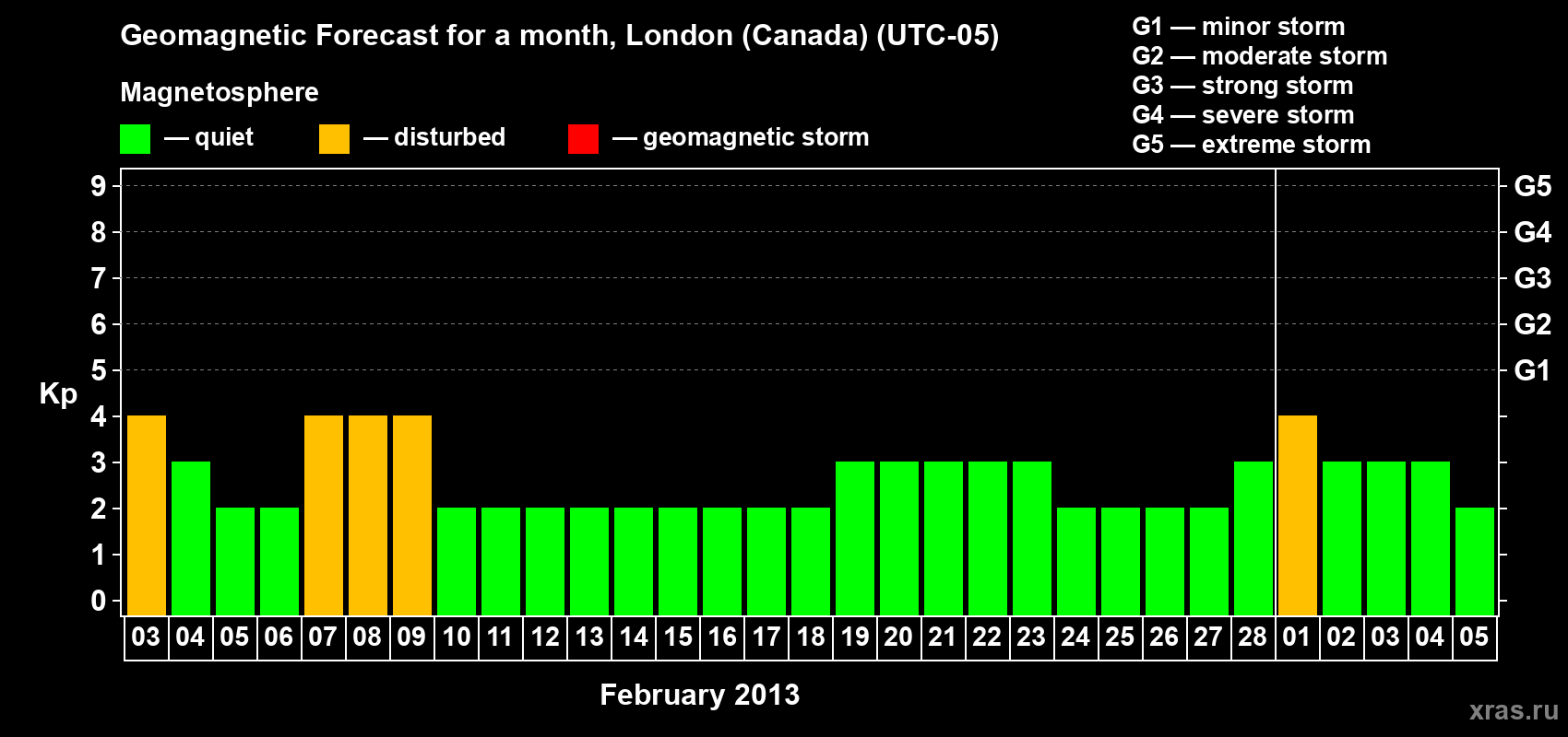 Geomagnetic storm forecast in London (Canada) for Feb 03, 2013