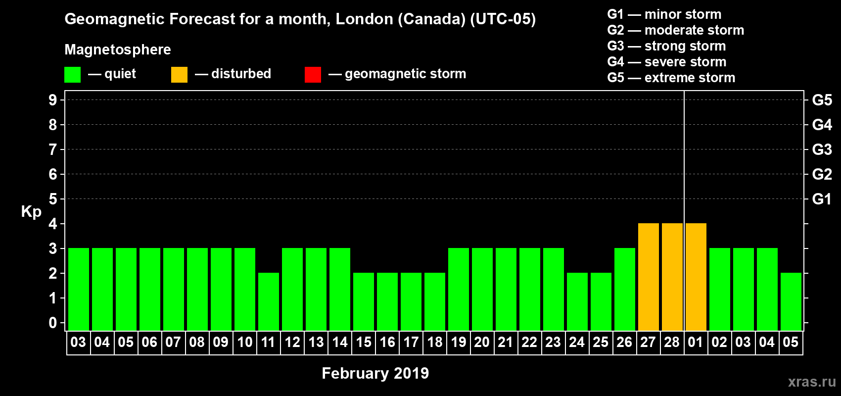 Geomagnetic storm forecast in London (Canada) for Feb 03, 2019
