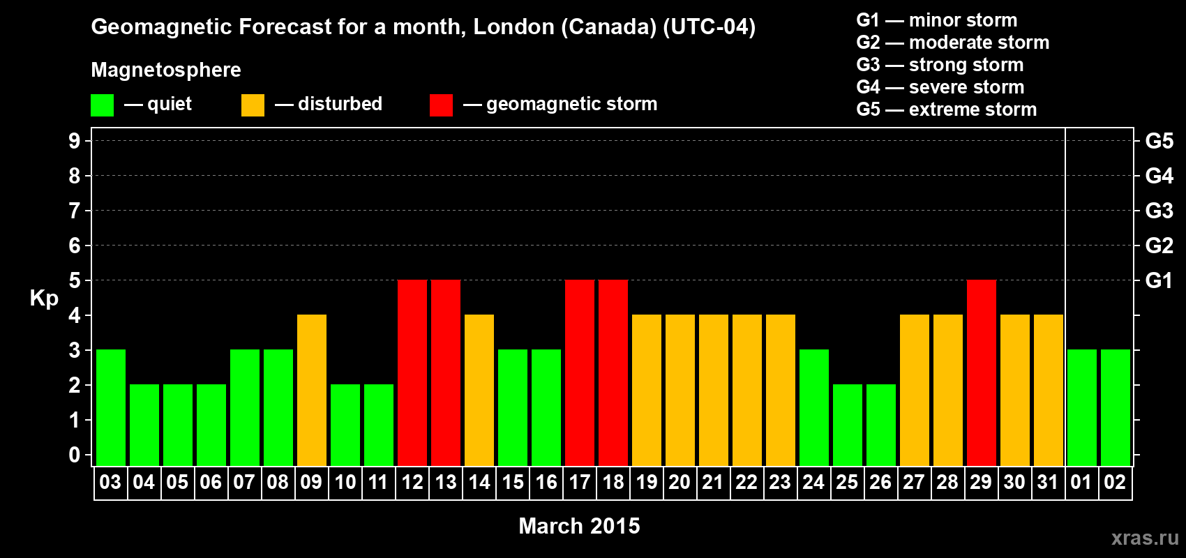 Geomagnetic storm forecast in London (Canada) for Mar 03, 2015