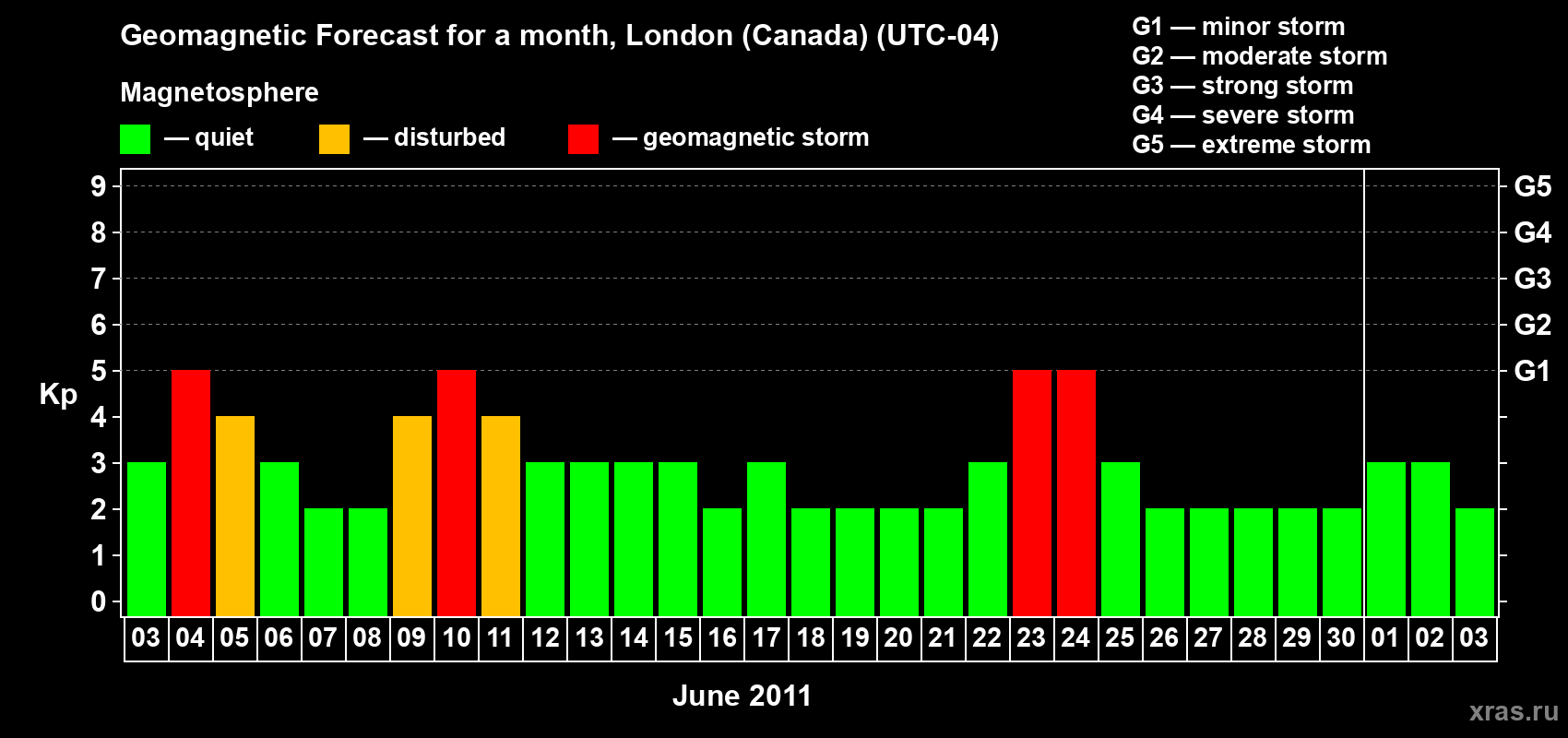 Geomagnetic storm forecast in London (Canada) for Jun 03, 2011