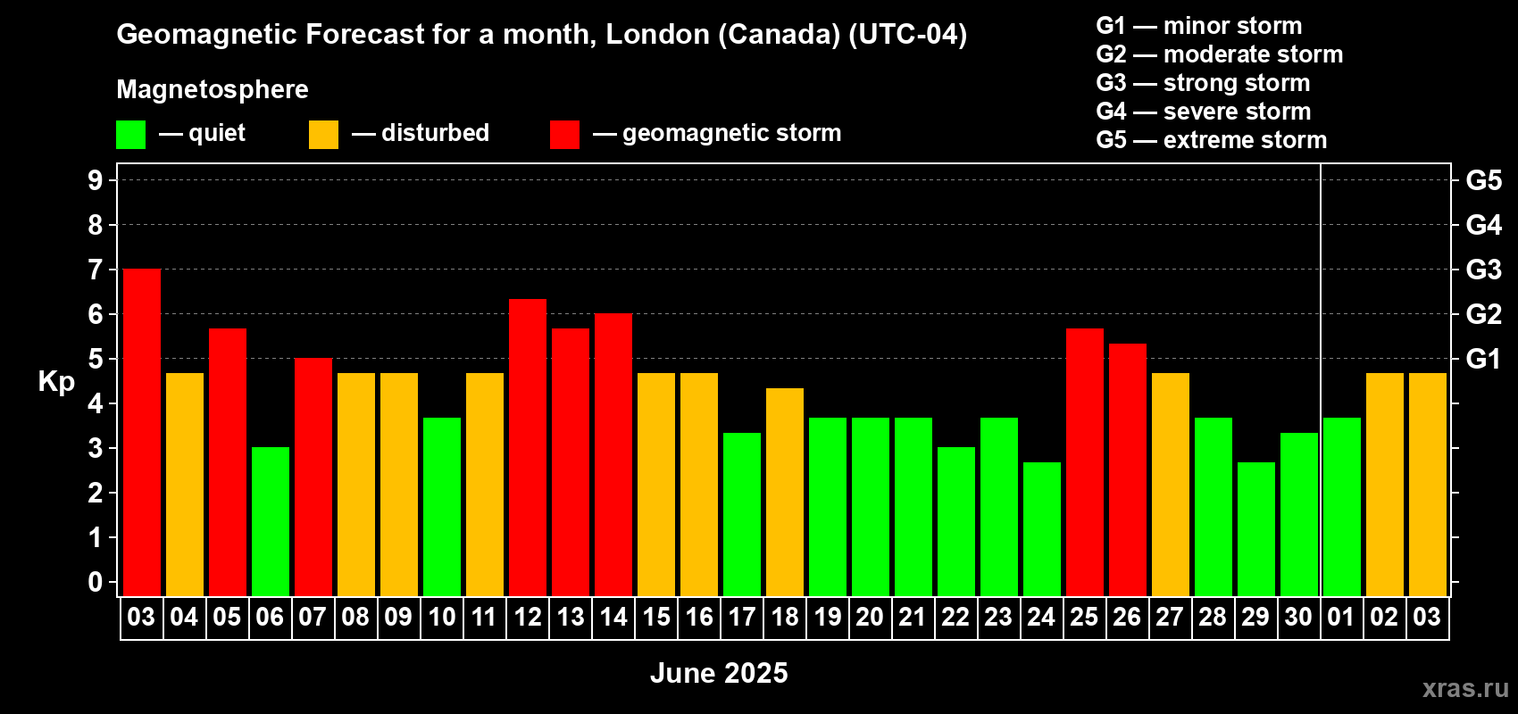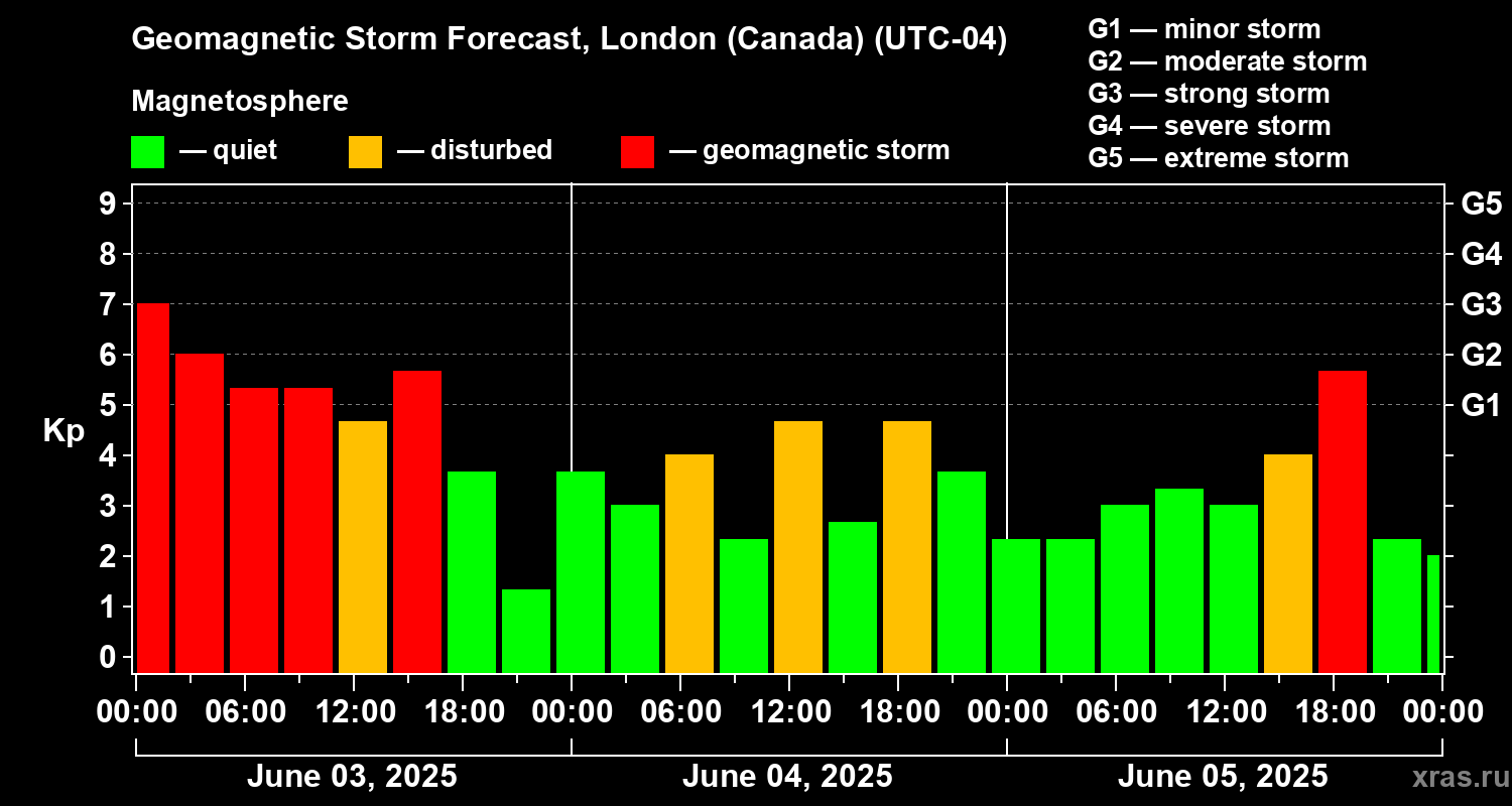 Geomagnetic storm forecast in London (Canada) for Jun 03, 2025