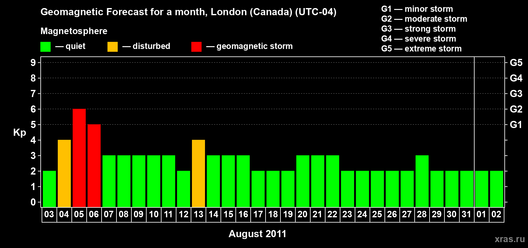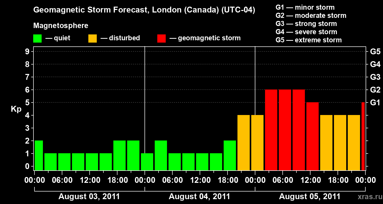 Geomagnetic storm forecast in London (Canada) for Aug 03, 2011