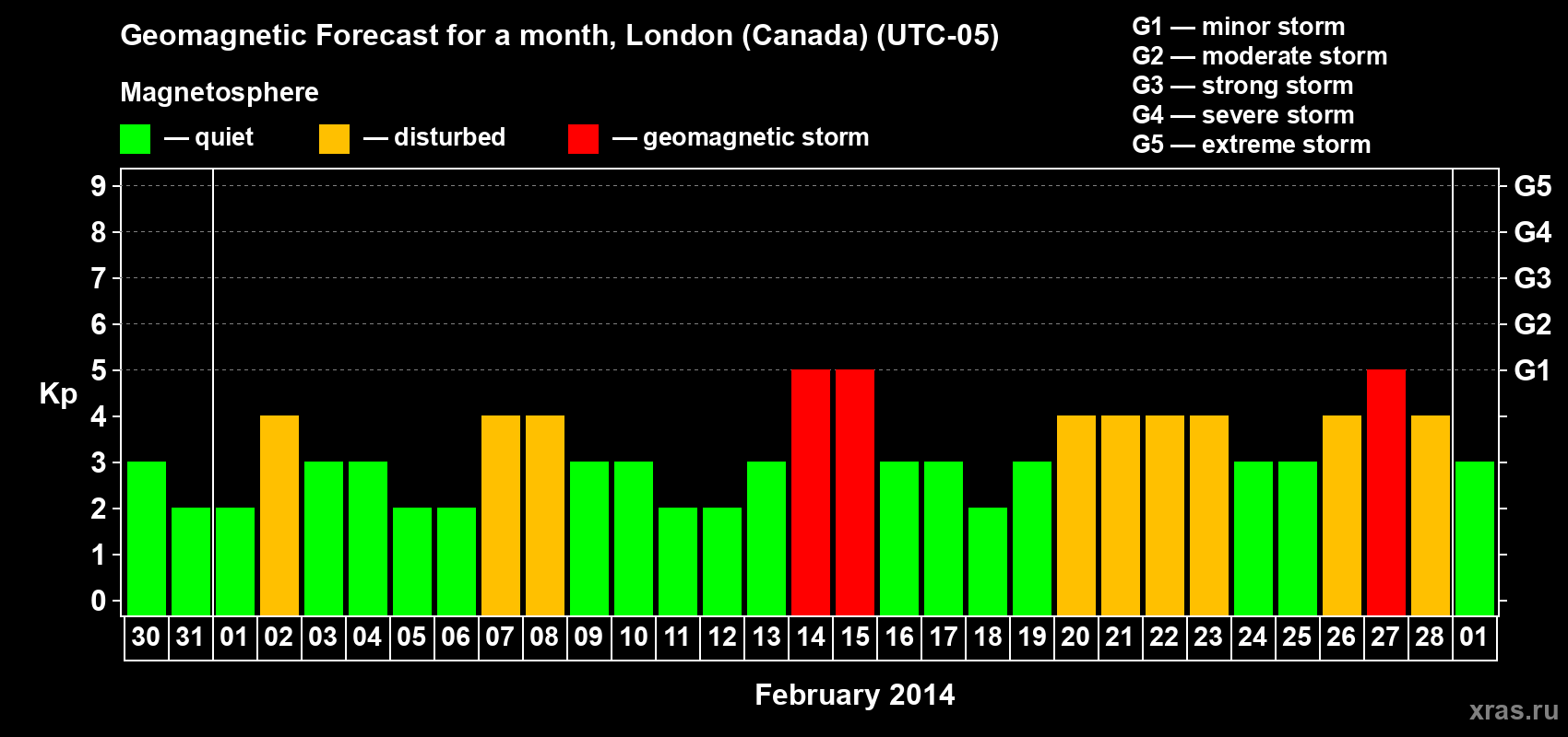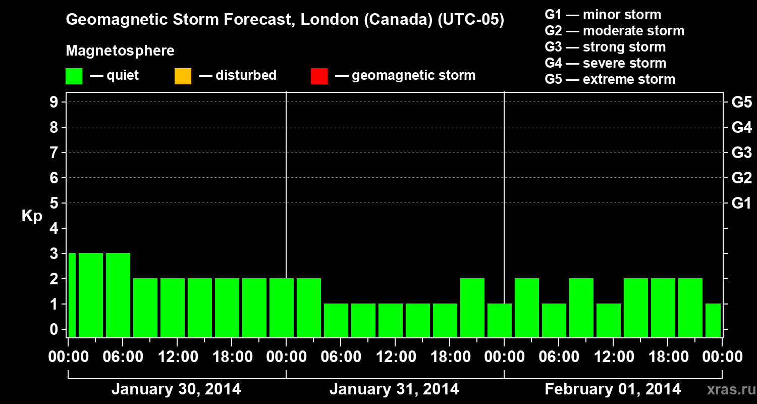 Geomagnetic storm forecast in London (Canada) for Jan 30, 2014