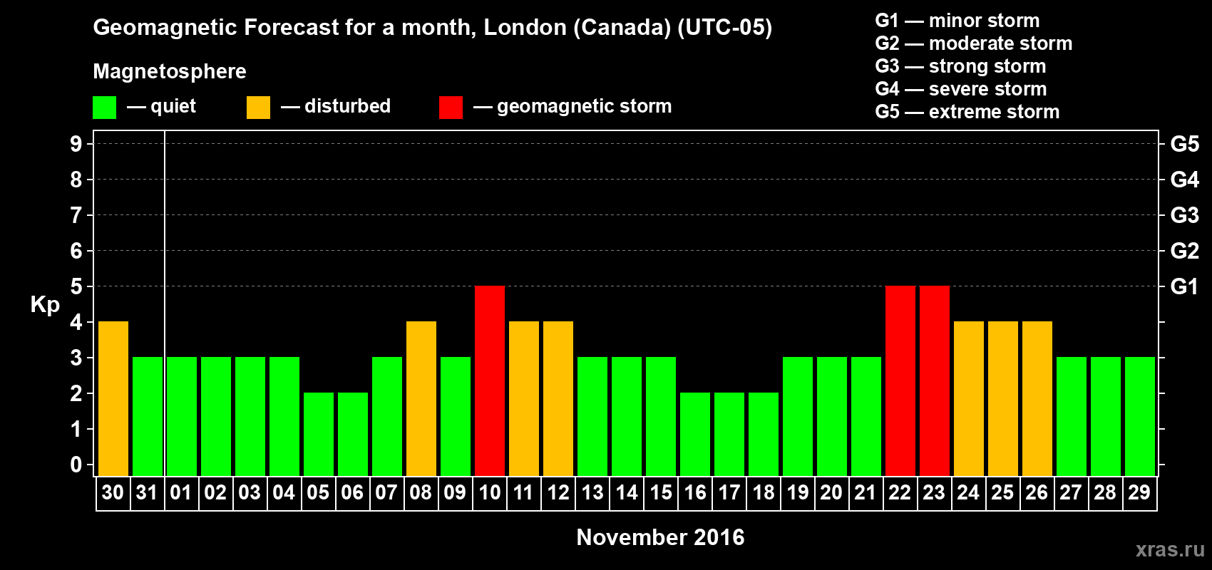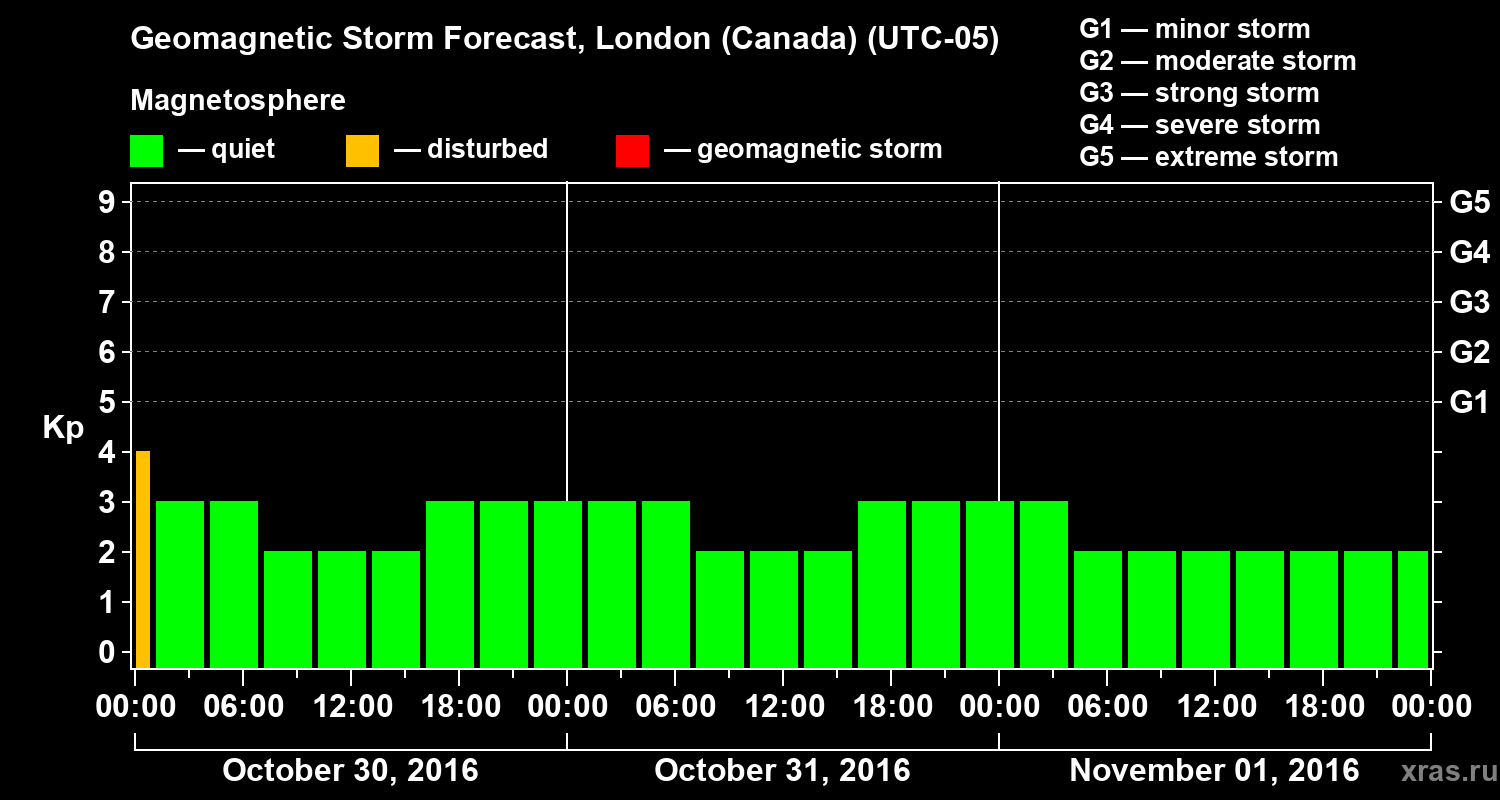 Geomagnetic storm forecast in London (Canada) for Oct 30, 2016