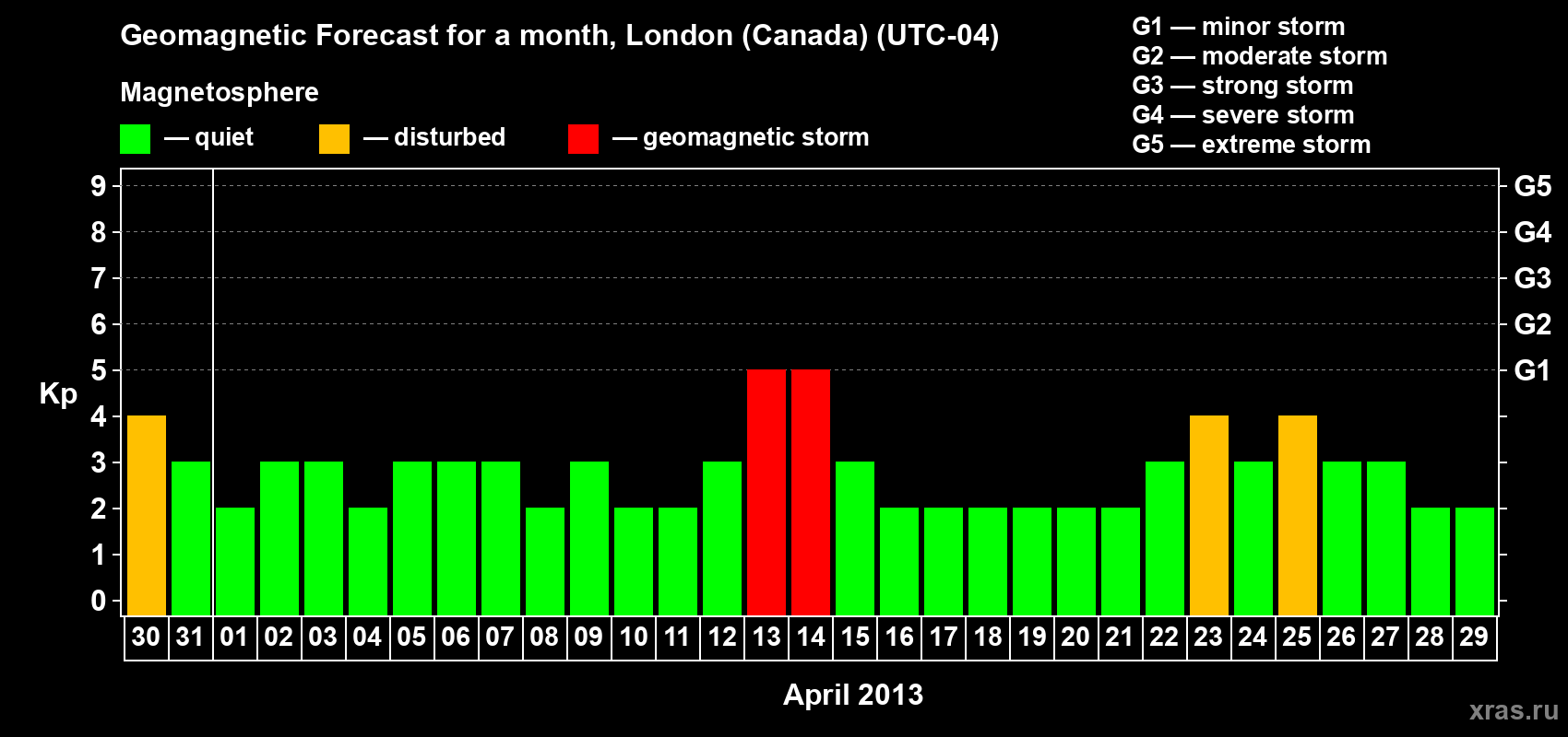 Geomagnetic storm forecast in London (Canada) for Mar 30, 2013
