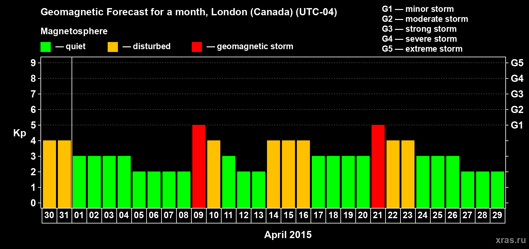 Geomagnetic storm forecast in London (Canada) for Mar 30, 2015