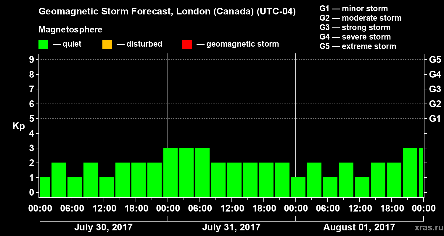 Geomagnetic storm forecast in London (Canada) for Jul 30, 2017