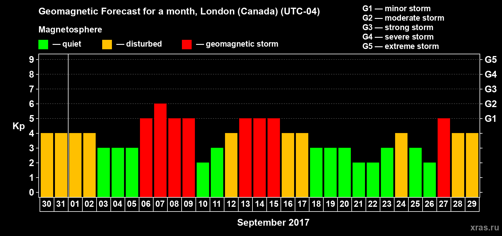 Geomagnetic storm forecast in London (Canada) for Aug 30, 2017