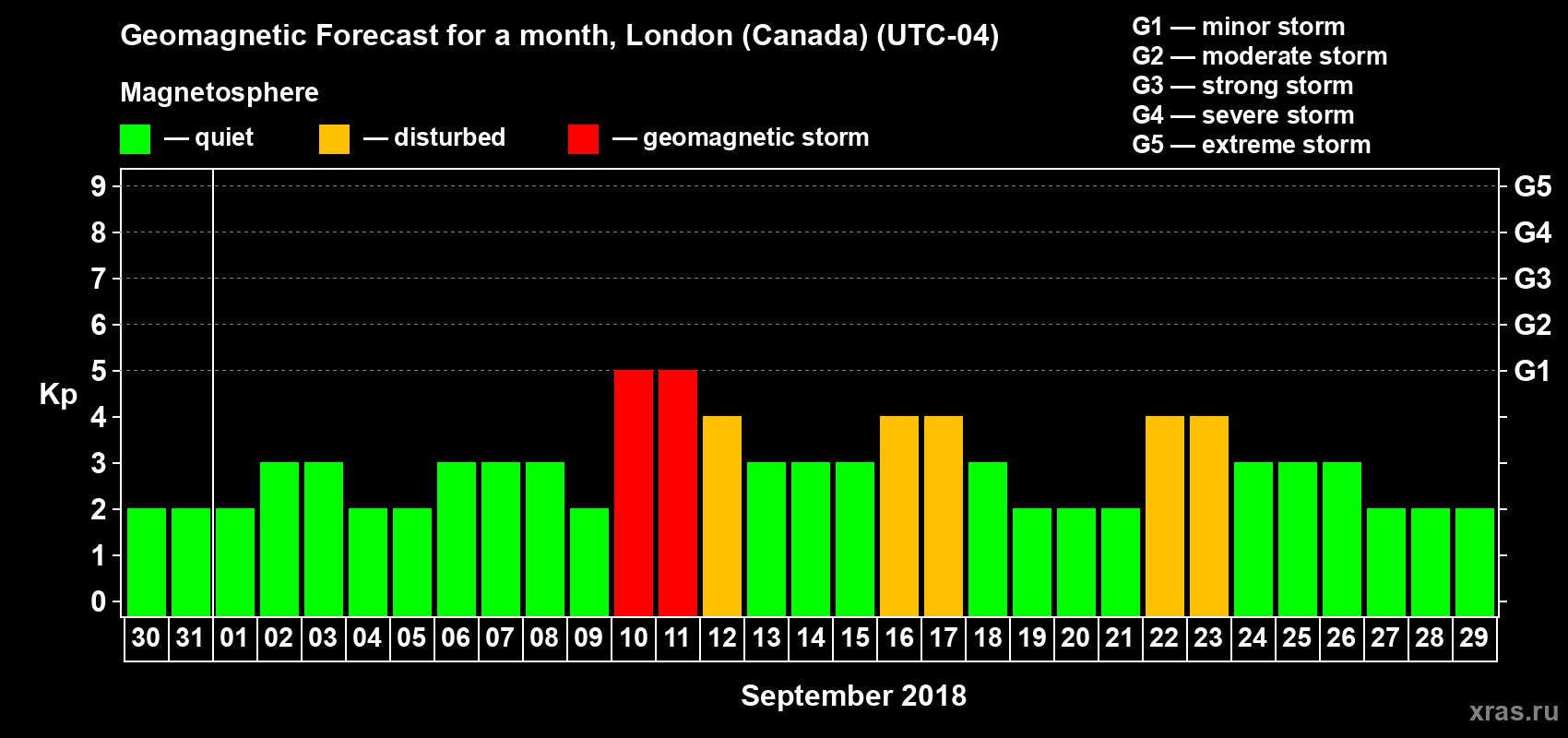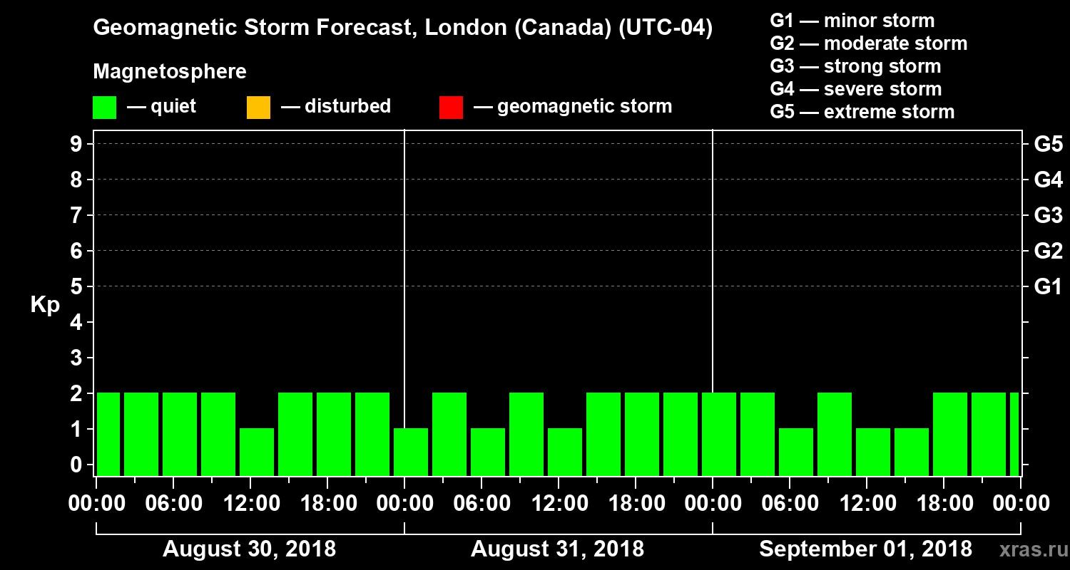 Geomagnetic storm forecast in London (Canada) for Aug 30, 2018