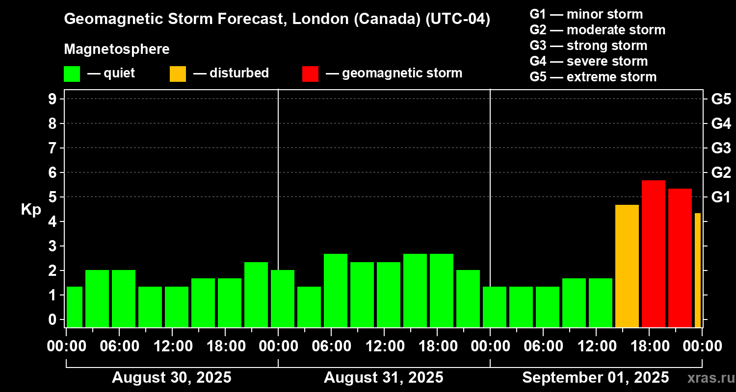 Geomagnetic storm forecast in London (Canada) for Aug 30, 2025
