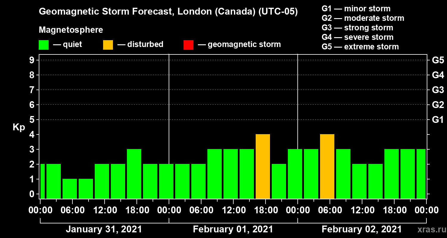 Geomagnetic storm forecast in London (Canada) for Jan 31, 2021