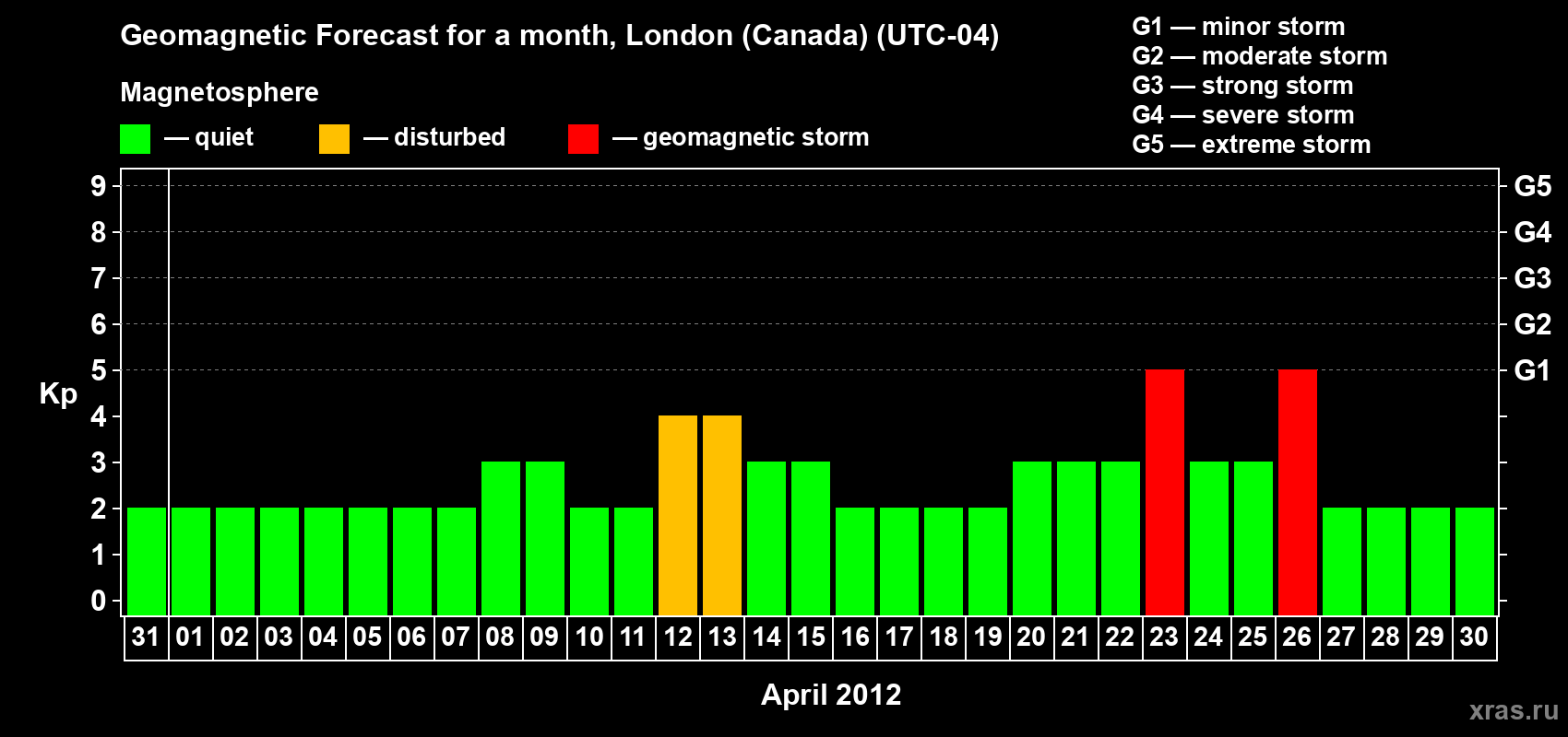 Geomagnetic storm forecast in London (Canada) for Mar 31, 2012