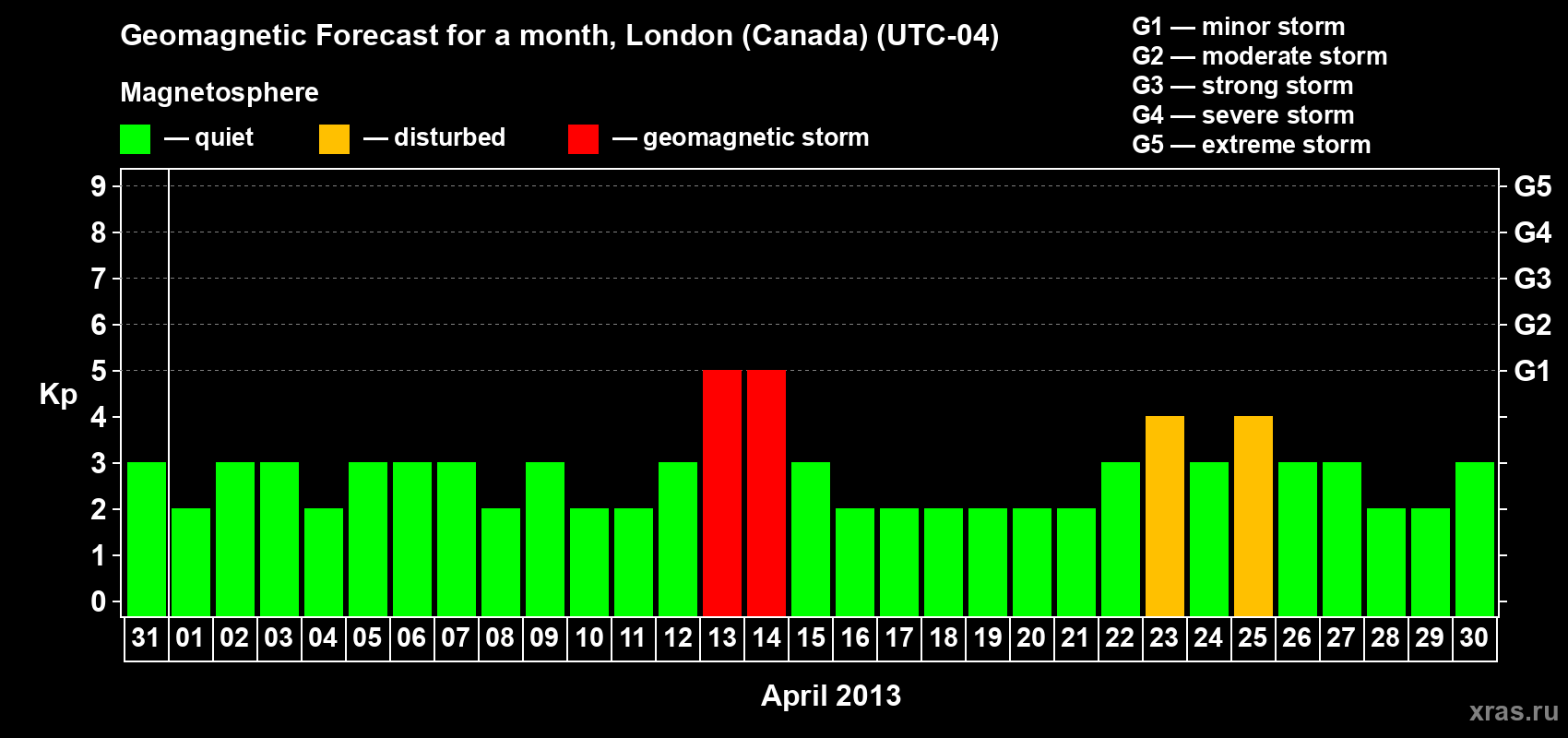 Geomagnetic storm forecast in London (Canada) for Mar 31, 2013
