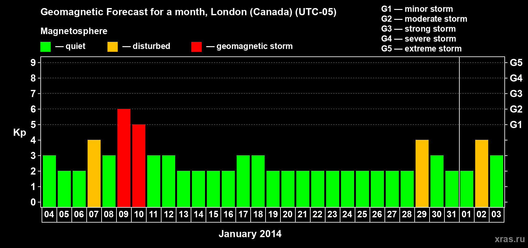 Geomagnetic storm forecast in London (Canada) for Jan 04, 2014